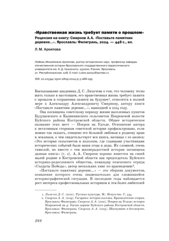 Высказывание академика Д. С. Лихачева о том, что человеку тесно жить только в настоящем, его нравственная жизнь требует памяти о прошлом и сохранения памяти на будущее1, относится в полной мере к Александру Александровичу Смирнову, автору книги «Поставьте памятник деревне…», вышедшей в 2024 году.