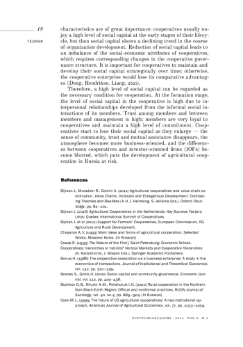 The article aims at identifying theoretical and practical reasons for the failure of the agricultural cooperation development in Russia. Authors suggest that rural cooperatives in Russia do not develop due to the general features of the formation of social capital in the Russian countryside, the lack of necessary institutional conditions, and the wrong idea that cooperatives based on the classical principles of cooperation can operate successfully in the contemporary economy and society. The first theoretical barrier to cooperation is that in the contemporary high-technology agriculture, hybrid structures (cooperatives) are less efficient than the hierarchical one used by agroholdings. The second theoretical barrier is the inconsistency of seven classical principles of cooperation formulated at the time of Raiffeisen (i. e. outdated) with today’s economic realities and their transformations. The third practical barrier is the rapid degradation of rural areas and the low level of trust and interaction between members of agricultural cooperatives, which is why there are no trends of the bottom-up development of cooperation. The authors conclude that a high level of social capital is the necessary condition for cooperation: at the formation stage, this level is high due to interpersonal relationships developed from the informal social interactions of its members and a high level of trust among members and between members and management, but cooperatives start to lose their social capital as they enlarge - the sense of community, trust and mutual assistance disappears, the atmosphere becomes more business-oriented.