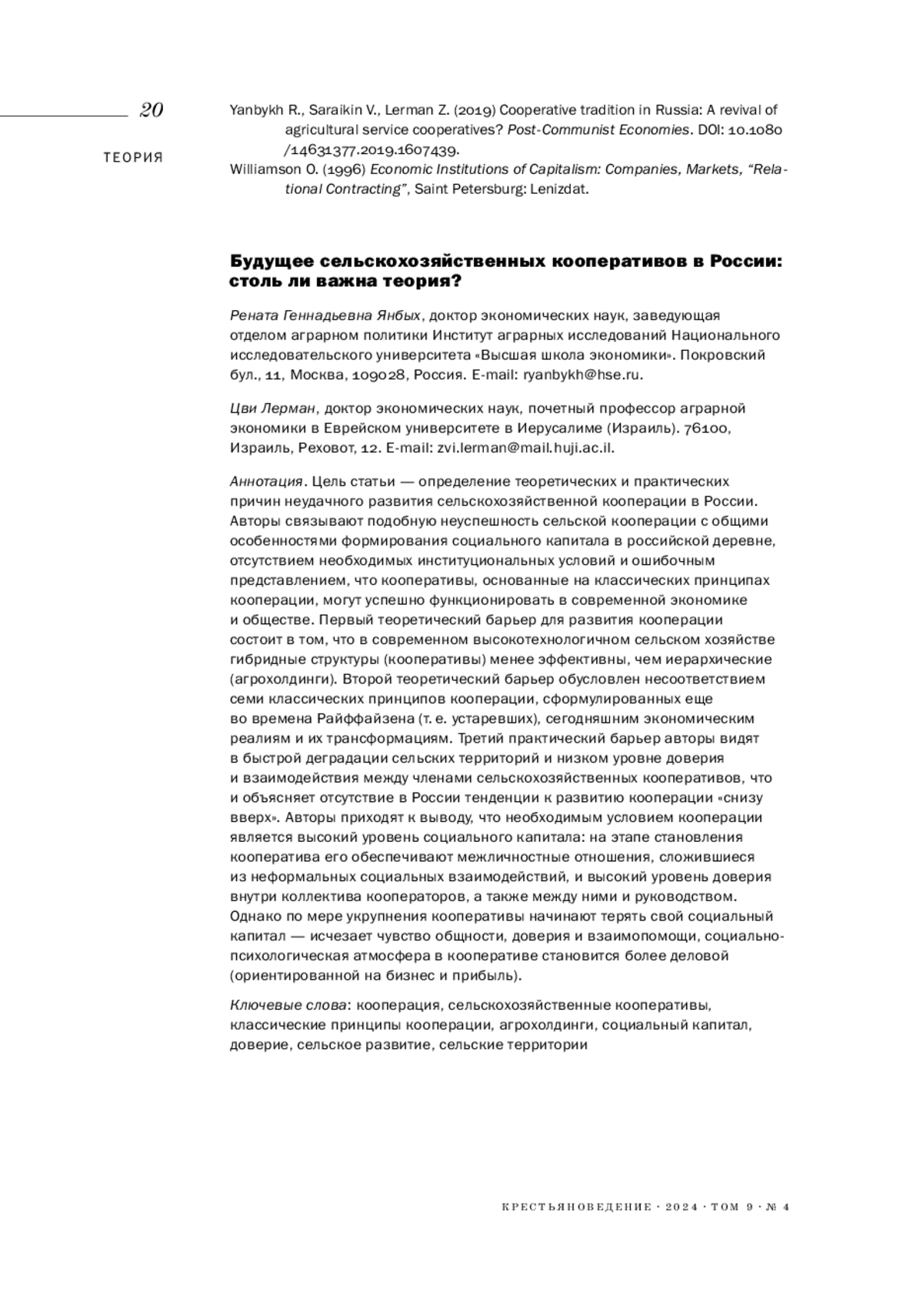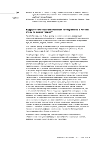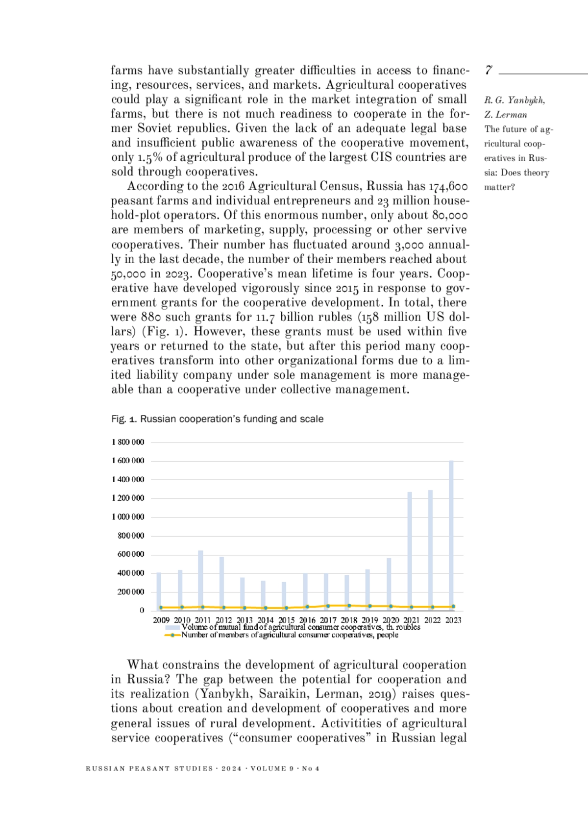 31. 	Yanbykh R., Saraikin V., Lerman Z. (2019) Cooperative tradition in Russia: A revival of agricultural service cooperatives? Post-Communist Economies.  DOI: 10.1080/14631377.2019.1607439  EDN: UZLOLG
