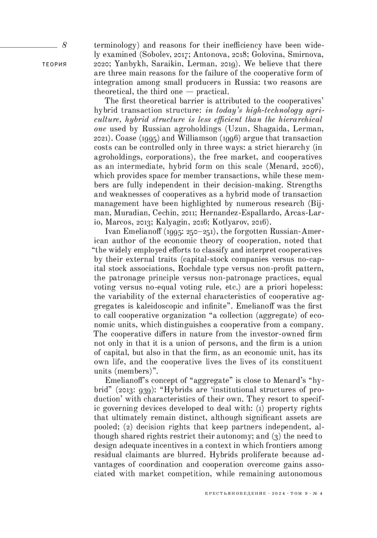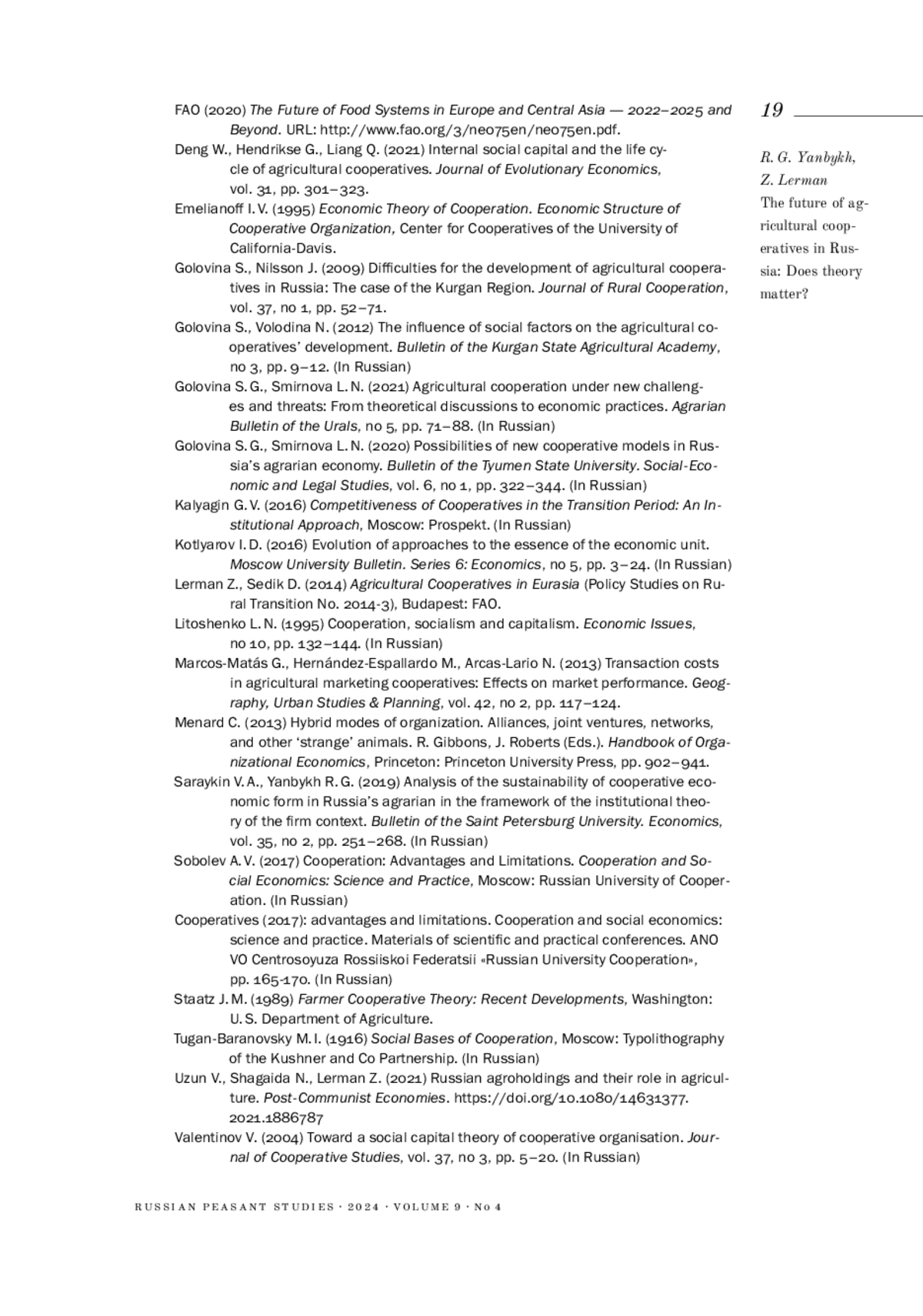 24. 	Saraykin V. A., Yanbykh R. G. (2019) Analysis of the sustainability of cooperative economic form in Russia’s agrarian in the framework of the institutional theory of the firm context. Bulletin of the Saint Petersburg University. Economics, vol. 35, no 2, pp. 251-268. (In Russian).  EDN: PBOUBC