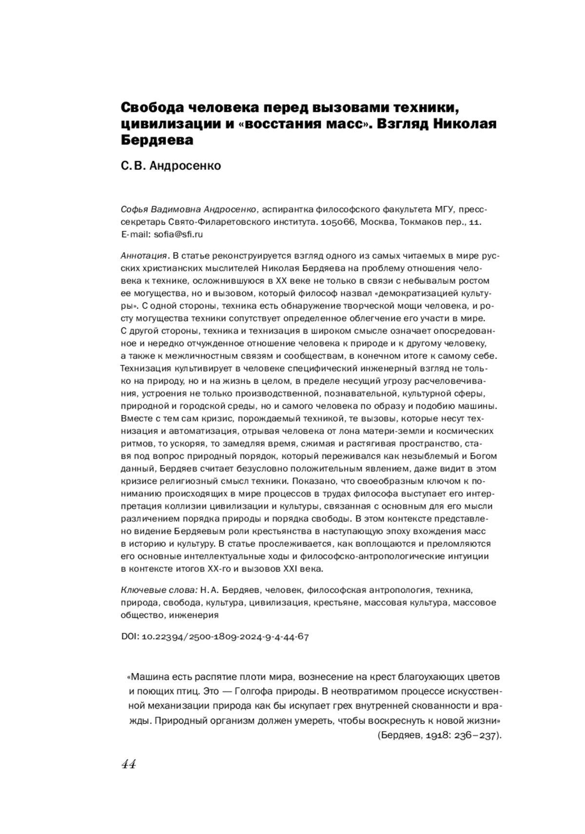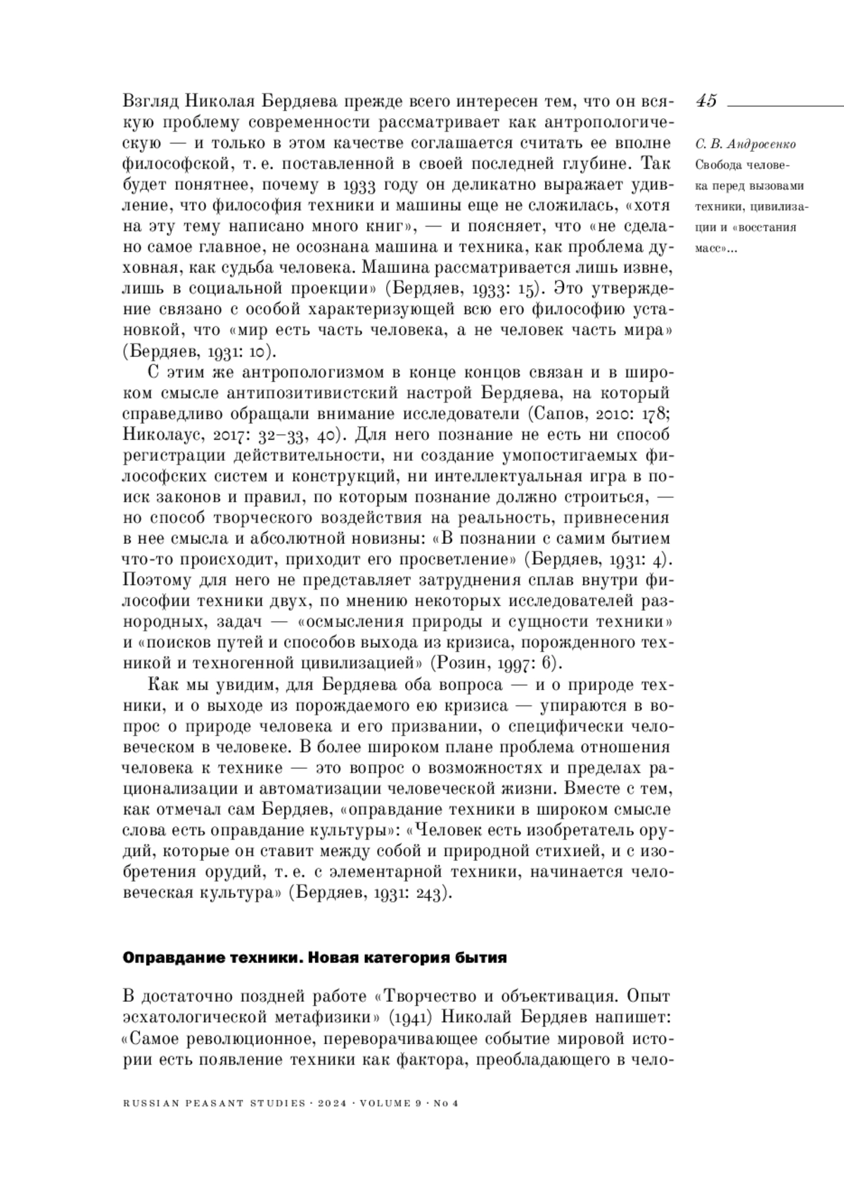 В статье реконструируется взгляд одного из самых читаемых в мире русских христианских мыслителей Николая Бердяева на проблему отношения человека к технике, осложнившуюся в XX веке не только в связи с небывалым ростом ее могущества, но и вызовом, который философ назвал «демократизацией культуры». С одной стороны, техника есть обнаружение творческой мощи человека, и росту могущества техники сопутствует определенное облегчение его участи в мире. С другой стороны, техника и технизация в широком смысле означает опосредованное и нередко отчужденное отношение человека к природе и к другому человеку, а также к межличностным связям и сообществам, в конечном итоге к самому себе. Технизация культивирует в человеке специфический инженерный взгляд не только на природу, но и на жизнь в целом, в пределе несущий угрозу расчеловечивания, устроения не только производственной, познавательной, культурной сферы, природной и городской среды, но и самого человека по образу и подобию машины. Вместе с тем сам кризис, порождаемый техникой, те вызовы, которые несут технизация и автоматизация, отрывая человека от лона матери-земли и космических ритмов, то ускоряя, то замедляя время, сжимая и растягивая пространство, ставя под вопрос природный порядок, который переживался как незыблемый и Богом данный, Бердяев считает безусловно положительным явлением, даже видит в этом кризисе религиозный смысл техники. Показано, что своеобразным ключом к пониманию происходящих в мире процессов в трудах философа выступает его интерпретация коллизии цивилизации и культуры, связанная с основным для его мысли различением порядка природы и порядка свободы. В этом контексте представлено видение Бердяевым роли крестьянства в наступающую эпоху вхождения масс в историю и культуру. В статье прослеживается, как воплощаются и преломляются его основные интеллектуальные ходы и философско-антропологические интуиции в контексте итогов XX-го и вызовов XXI века.