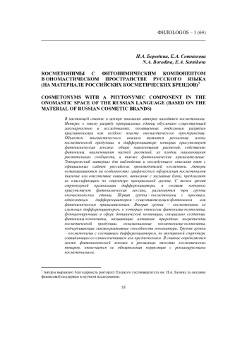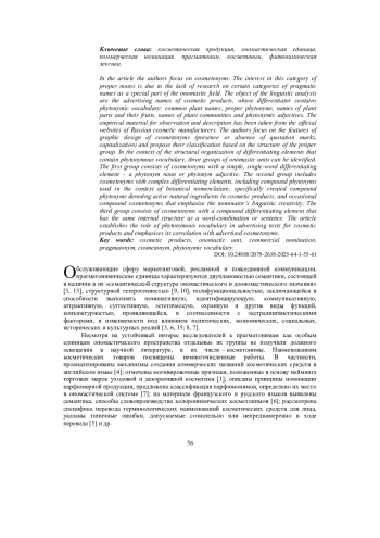 В настоящей статье в центре внимания авторов находятся косметонимы. Интерес к этому разряду проприальных единиц обусловлен существующей лакунарностью в исследованиях, посвященных отдельным разрядам прагматонимии как особого пласта ономастического пространства. Объектом лингвистического анализа являются рекламные имена косметической продукции, в дифференциаторе которых присутствует фитонимическая лексика: общие наименования растений, собственно фитонимы, наименования частей растений, их плодов, наименования растительных сообществ, а также фитонимические прилагательные. Эмпирический материал для наблюдения и последующего описания взят с официальных сайтов российских производителей косметики. Авторы останавливаются на особенностях графического оформления косметонимов (наличие или отсутствие кавычек, написание с заглавных букв), предлагают их классификацию по структуре проприальной группы. С точки зрения структурной организации дифференциатора, в составе которого присутствует фитонимическая лексика, различаются три группы ономастических единиц. Первая группа - косметонимы с простым, однословным дифференциатором - существительным-фитонимом или фитонимическим прилагательным. Вторая группа - косметонимы со сложным дифференциатором, к которым отнесены фитонимы-композиты, функционирующие в сфере ботанической номинации, специально созданные фитонимы-композиты, называющие активные природные ингредиенты косметической продукции, окказиональные косметонимы-композиты, подчеркивающие лингвокреативные способности номинатора. Третья группа - косметонимы с составным дифференциатором, по внутренней структуре совпадающим со словосочетанием или предложением. В статье определяется место фитонимической лексики в рекламных текстах косметических товаров, отмечается ее обязательная корреляция с рекламируемыми косметонимами.