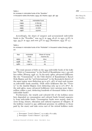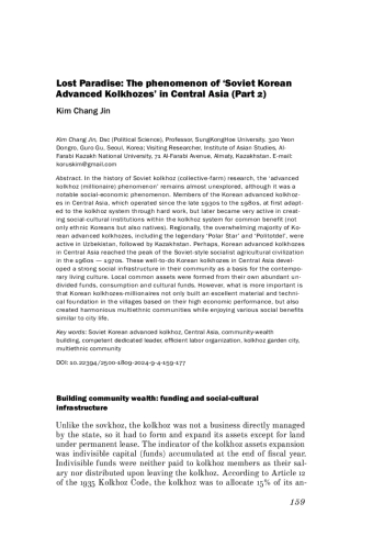 In the history of Soviet kolkhoz (collective-farm) research, the ‘advanced kolkhoz (millionaire) phenomenon’ remains almost unexplored, although it was a notable social-economic phenomenon. Members of the Korean advanced kolkhozes in Central Asia, which operated since the late 1930s to the 1980s, at first adapted to the kolkhoz system through hard work, but later became very active in creating social-cultural institutions within the kolkhoz system for common benefit (not only ethnic Koreans but also natives). Regionally, the overwhelming majority of Korean advanced kolkhozes, including the legendary ‘Polar Star’ and ‘Politotdel’, were active in Uzbekistan, followed by Kazakhstan. Perhaps, Korean advanced kolkhozes in Central Asia reached the peak of the Soviet-style socialist agricultural civilization in the 1960s - 1970s. These well-to-do Korean kolkhozes in Central Asia developed a strong social infrastructure in their community as a basis for the contemporary living culture. Local common assets were formed from their own abundant undivided funds, consumption and cultural funds. However, what is more important is that Korean kolkhozes-millionaires not only built an excellent material and technical foundation in the villages based on their high economic performance, but also created harmonious multiethnic communities while enjoying various social benefits similar to city life.