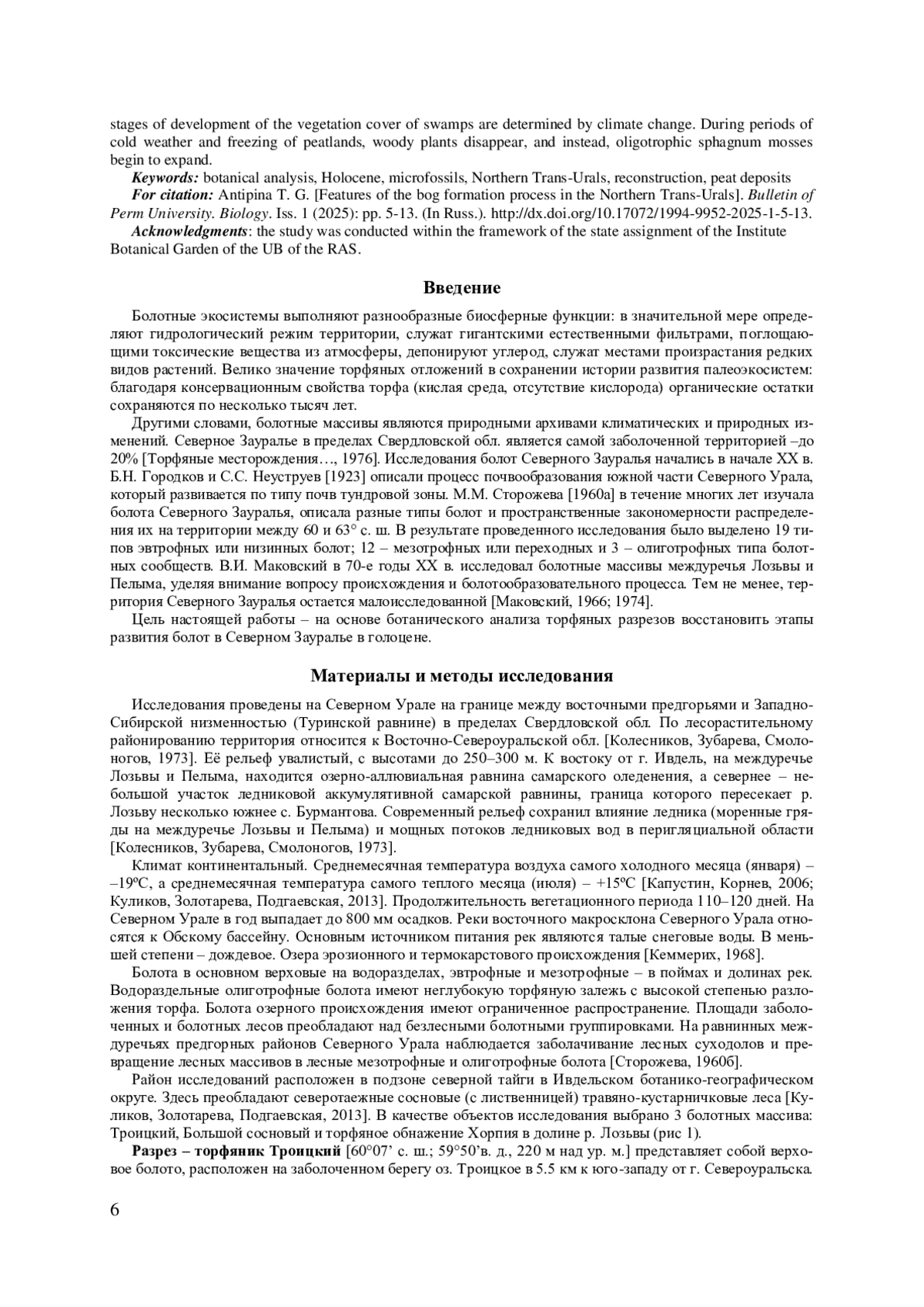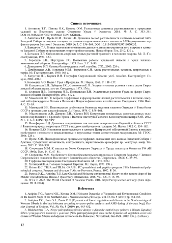 1. 	Антипина Т.Г., Панова Н.К., Корона О.М. Голоценовая динамика растительности и природных условий на Восточном склоне Северного Урала // Экология. 2014. № 5. С. 353-361. DOI: 10.7868/S0367059714050023 EDN: SKIBQL
