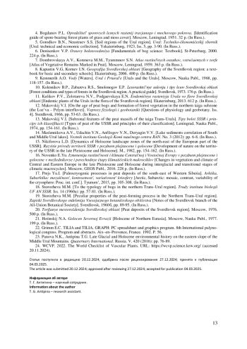 12. 	Маковский В.И. О возрасте торфяников и формировании лесной растительности в подзоне северной тайги (междуречье Лозьвы и Пелыма) // Вопросы физиологии и геоботаники. Свердловск, 1966. Вып. 4. С. 53-63.