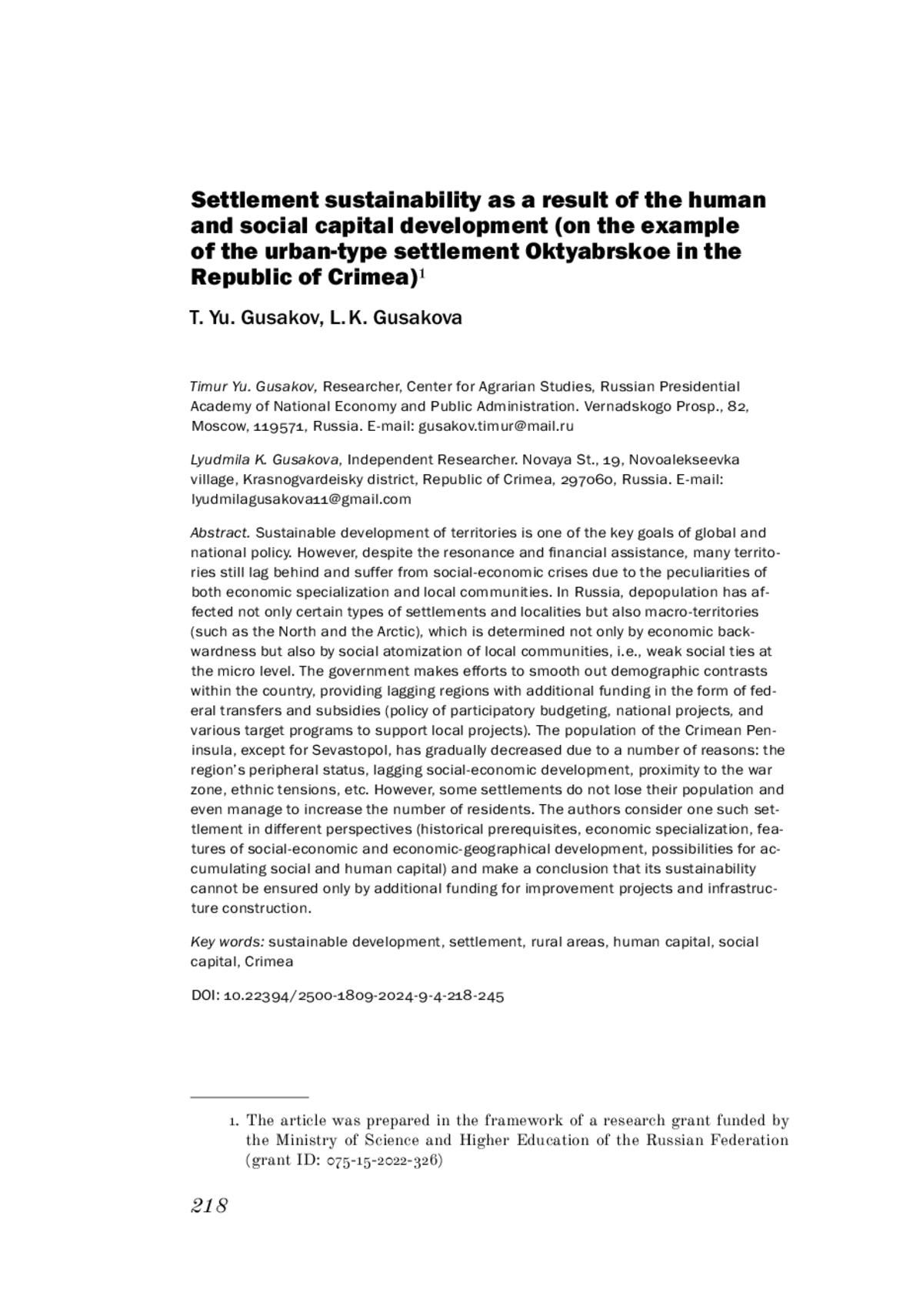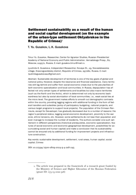 Sustainable development of territories is one of the key goals of global and national policy. However, despite the resonance and financial assistance, many territories still lag behind and suffer from social-economic crises due to the peculiarities of both economic specialization and local communities. In Russia, depopulation has affected not only certain types of settlements and localities but also macro-territories (such as the North and the Arctic), which is determined not only by economic backwardness but also by social atomization of local communities, i. e., weak social ties at the micro level. The government makes efforts to smooth out demographic contrasts within the country, providing lagging regions with additional funding in the form of federal transfers and subsidies (policy of participatory budgeting, national projects, and various target programs to support local projects). The population of the Crimean Peninsula, except for Sevastopol, has gradually decreased due to a number of reasons: the region’s peripheral status, lagging social-economic development, proximity to the war zone, ethnic tensions, etc. However, some settlements do not lose their population and even manage to increase the number of residents. The authors consider one such settlement in different perspectives (historical prerequisites, economic specialization, features of social-economic and economic-geographical development, possibilities for accumulating social and human capital) and make a conclusion that its sustainability cannot be ensured only by additional funding for improvement projects and infrastructure construction.