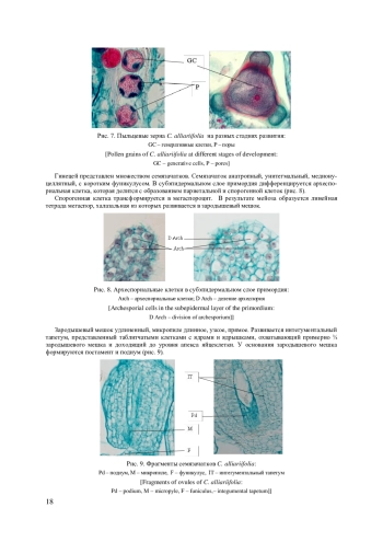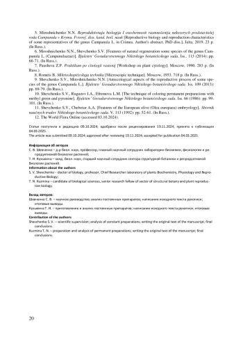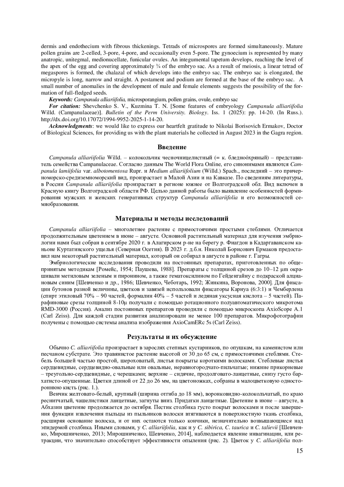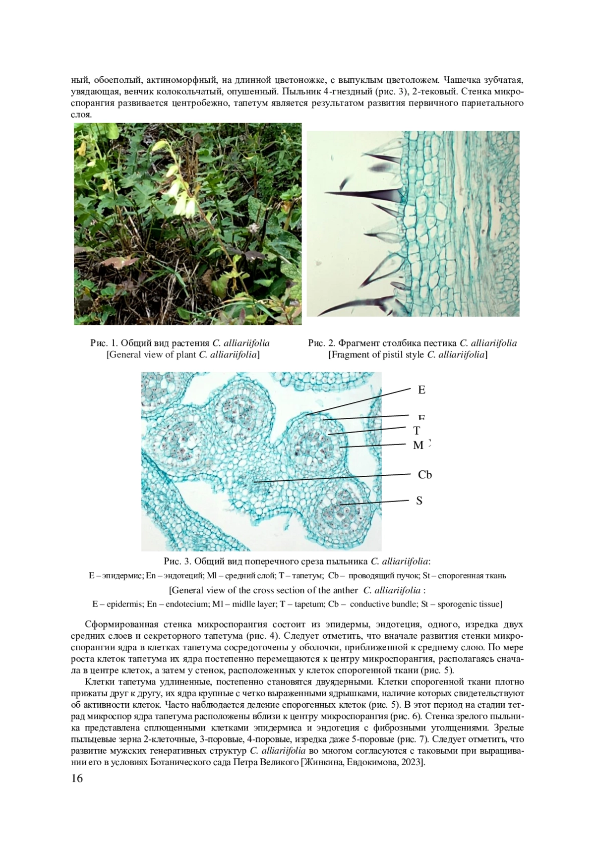 Представлены результаты изучения строения мужской и женской генеративных сфер колокольчика чесночницелистного Campanula alliariifolia Willd. (сем. Campanulaceae). Растительный материал для изучения процессов развития микро- и мегаспорангиев собирали на берегу реки Фиагдон в Куртатинском ущелье (Северная Осетия), а также в районе г. Гагра (Абхазия). Установлено, что тип формирования стенки микроспорангия центробежный, тапетум является результатом развития первичного париетального слоя. Сформированная стенка микроспорангия состоит из эпидермы, эндотеция, одного, изредка двух средних слоев и секреторного тапетума. Стенка зрелого пыльника представлена сплющенными клетками эпидермиса и эндотеция с фиброзными утолщениями. Тетрады микроспор образуются симультанно. Зрелые пыльцевые зерна 2-клеточные, 3-поровые, 4-поровые, изредка даже 5-поровые. Гинецей представлен множеством анатропных, унитегмальных, медионуцеллятных, фуникулярных семязачатков. Развивается интегументальный тапетум, доходящий до уровня апекса яйцеклетки и охватывающий примерно ¾ зародышевого мешка. В результате мейоза образуется линейная тетрада мегаспор, халазальная из которых развивается в зародышевый мешок. Зародышевый мешок удлиненный, микропиле длинное, узкое, прямое. У основания зародышевого мешка формируются постамент и подиум. Незначительное число аномалий в развитии мужских и женских элементов позволяет предположить возможность формирования полноценных семян.