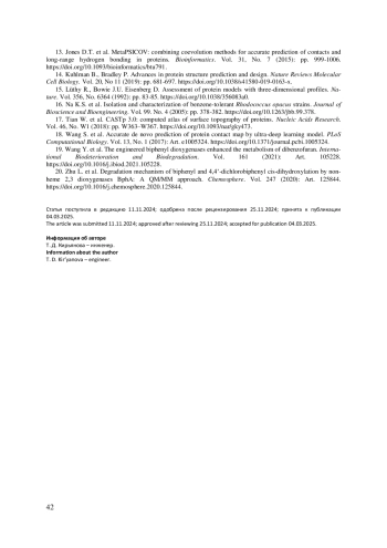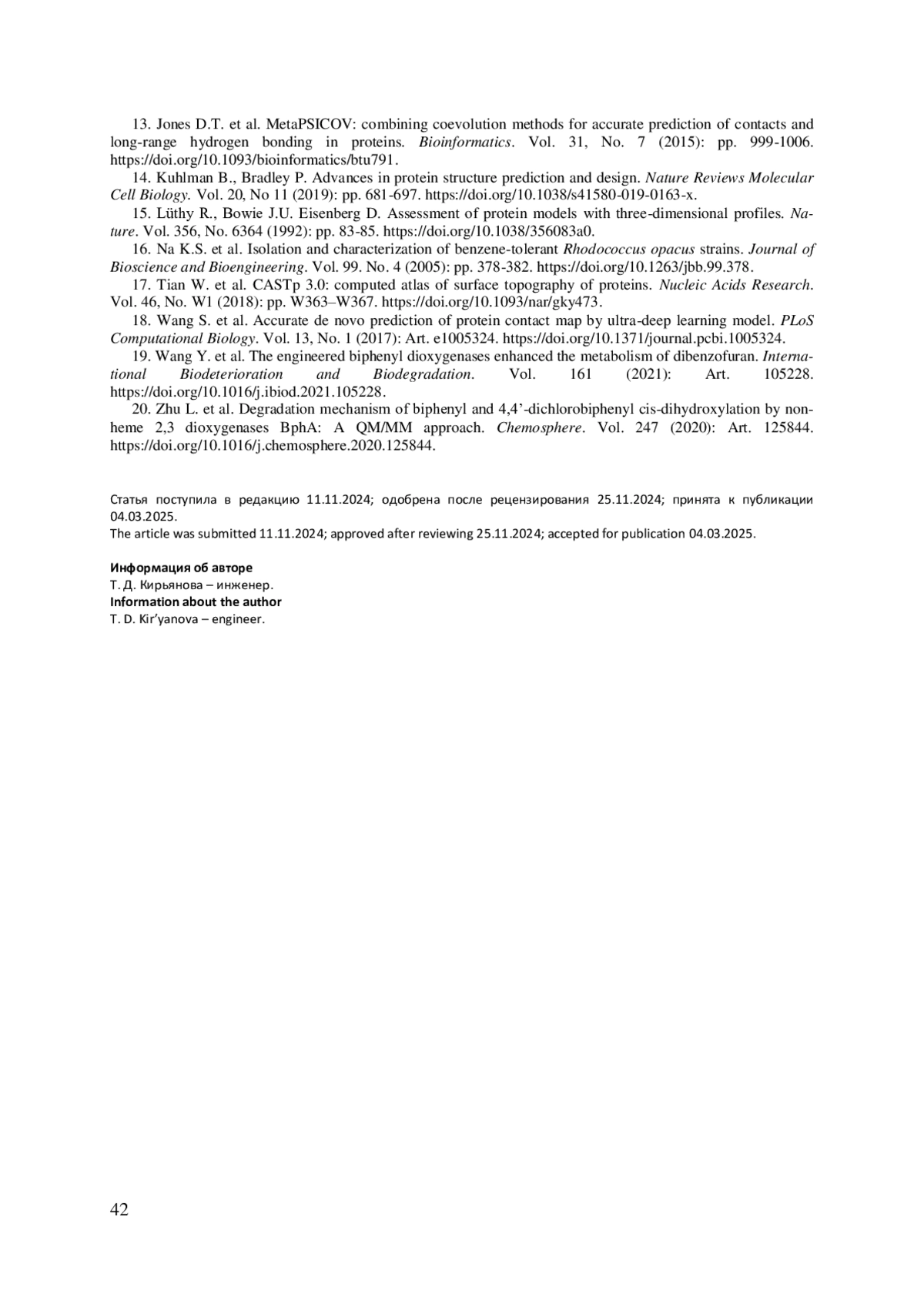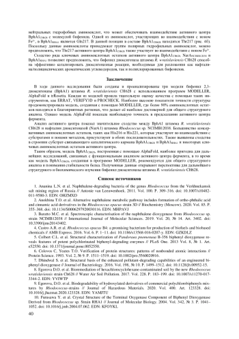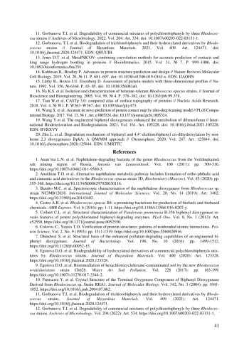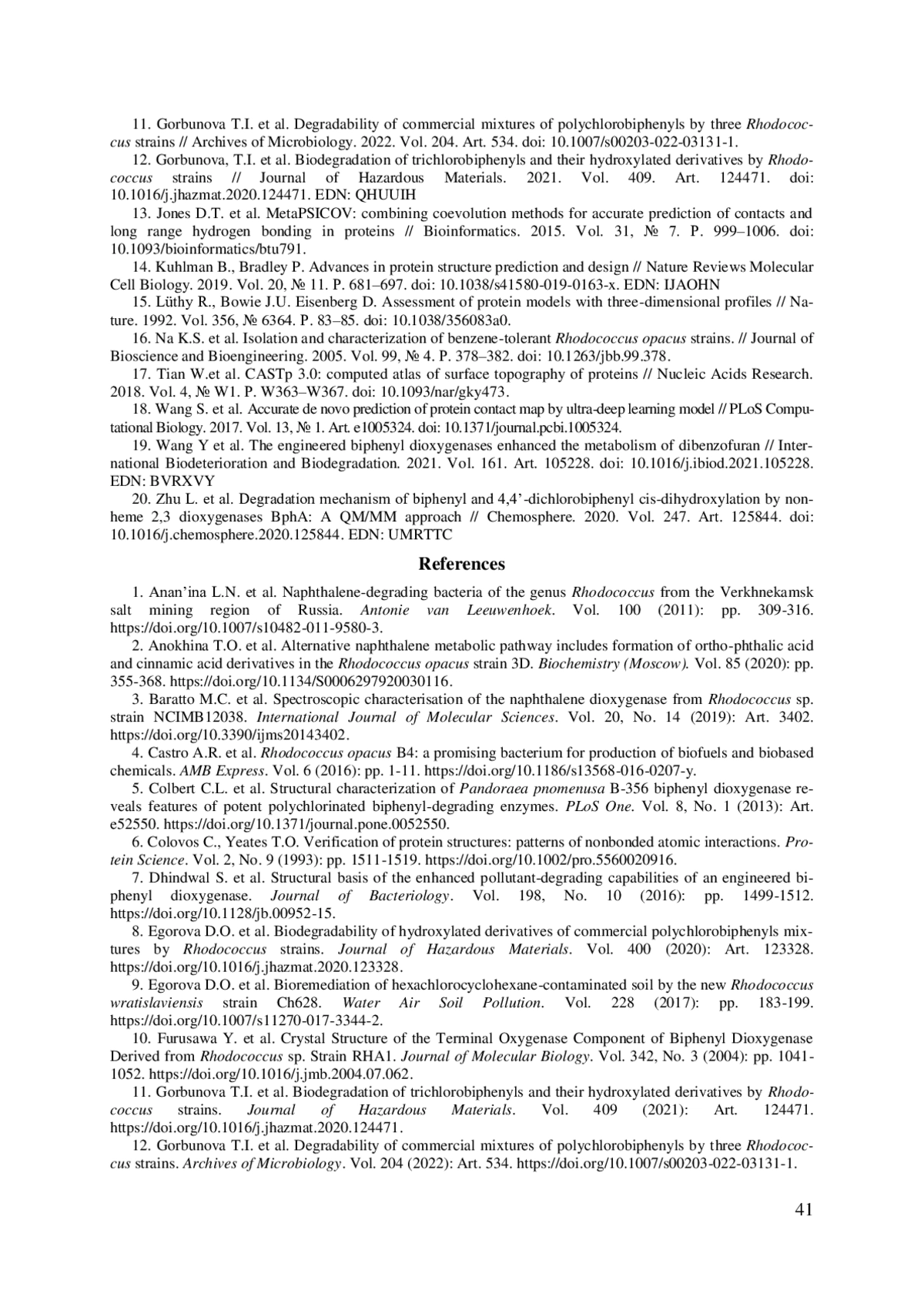 7. 	Dhindwal S. et al. Structural basis of the enhanced pollutant-degrading capabilities of an engineered biphenyl dioxygenase // Journal of Bacteriology. 2016. Vol. 198, № 10. Р. 1499-1512. DOI: 10.1128/jb.00952-15