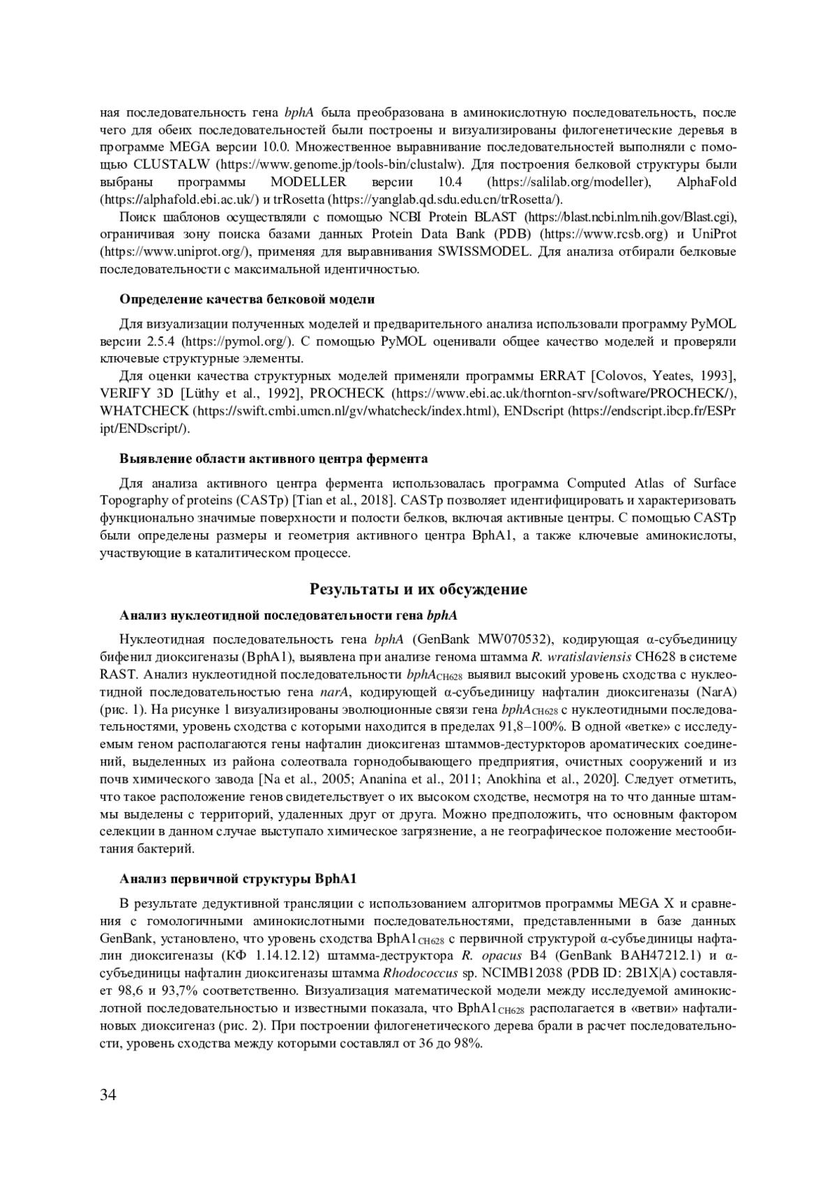 Выполнено моделирование трёхмерной структуры α-субъединицы бифенил диоксигеназы (BphA1) штамма Rhodococcus wratislaviensis CH628 с использованием программ MODELLER, AlphaFold и trRosetta. Нуклеотидная последовательность гена bphA установлена при анализе полногеномной последовательности штамма в системе RAST. Филогенетический анализ bphAСН628 показал высокую степень сходства с α-субъединицей нафталин диоксигеназы (narA). Для оценки качества полученных моделей использовались программы ERRAT, VERIFY3D и PROCHECK. Модель BphA1СН628, построенная с помощью MODELLER, продемонстрировала наивысшую структурную точность, в то время как модель BphA1СН628 AlphaFold лучше предсказала активный центр фермента. Анализ активного центра показал консервативность ключевых аминокислот, участвующих в катализе, что подтверждает функциональную схожесть с нафталин диоксигеназой. Полученные результаты открывают перспективы для дальнейшего исследования BphA1 в контексте его применения в биоремедиации.