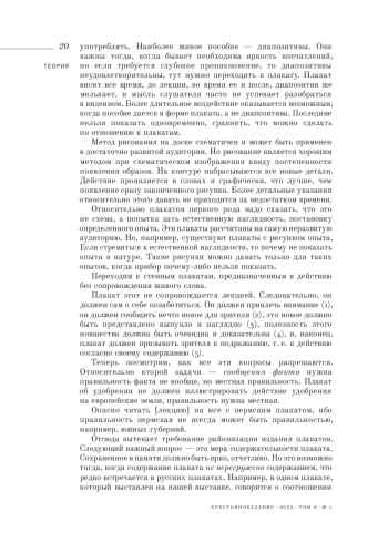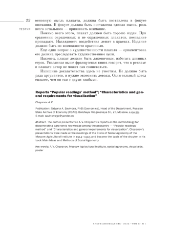 В публикации представлены два доклада А. В. Чаянова, отражающие его представления о методологии работы по распространению агрономических знаний в крестьянской среде: «Методика популярных чтений» и «Характеристика и общие требования наглядности». Доклады сделаны на заседаниях Кружка общественной агрономии Московского сельскохозяйственного института в 1914-1915 годах и являются основой одной из глав монографии «Основные идеи и методы работы общественной агрономии».