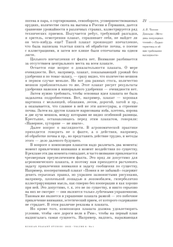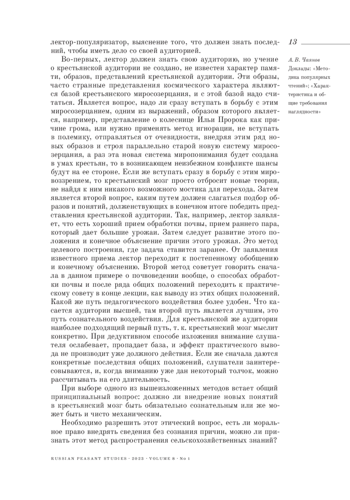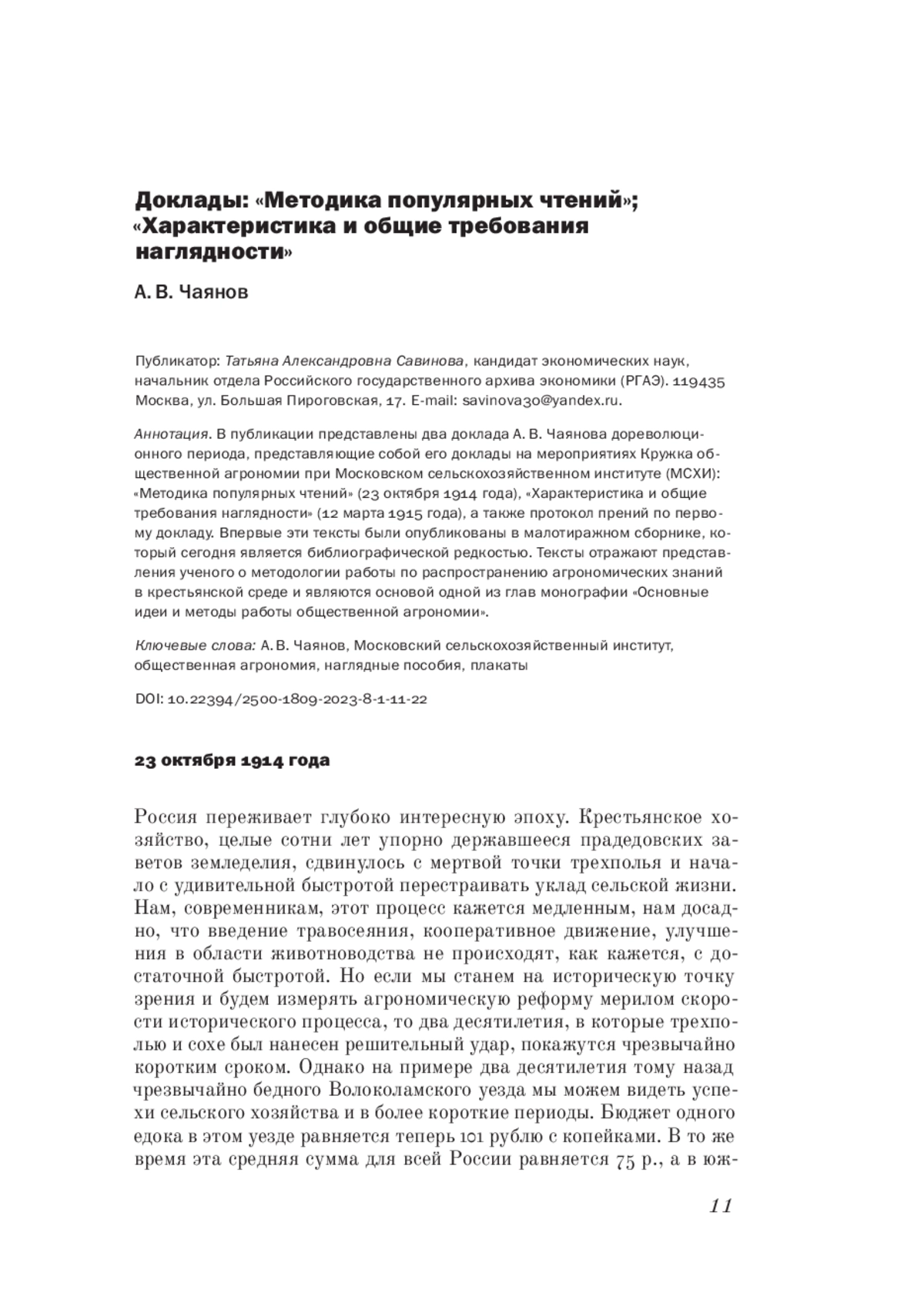 В публикации представлены два доклада А. В. Чаянова дореволюционного периода, представляющие собой его доклады на мероприятиях Кружка общественной агрономии при Московском сельскохозяйственном институте (МСХИ): «Методика популярных чтений» (23 октября 1914 года), «Характеристика и общие требования наглядности» (12 марта 1915 года), а также протокол прений по первому докладу. Впервые эти тексты были опубликованы в малотиражном сборнике, который сегодня является библиографической редкостью. Тексты отражают представления ученого о методологии работы по распространению агрономических знаний в крестьянской среде и являются основой одной из глав монографии «Основные идеи и методы работы общественной агрономии».