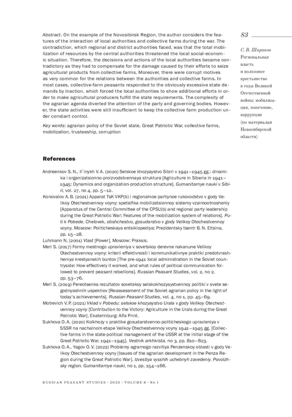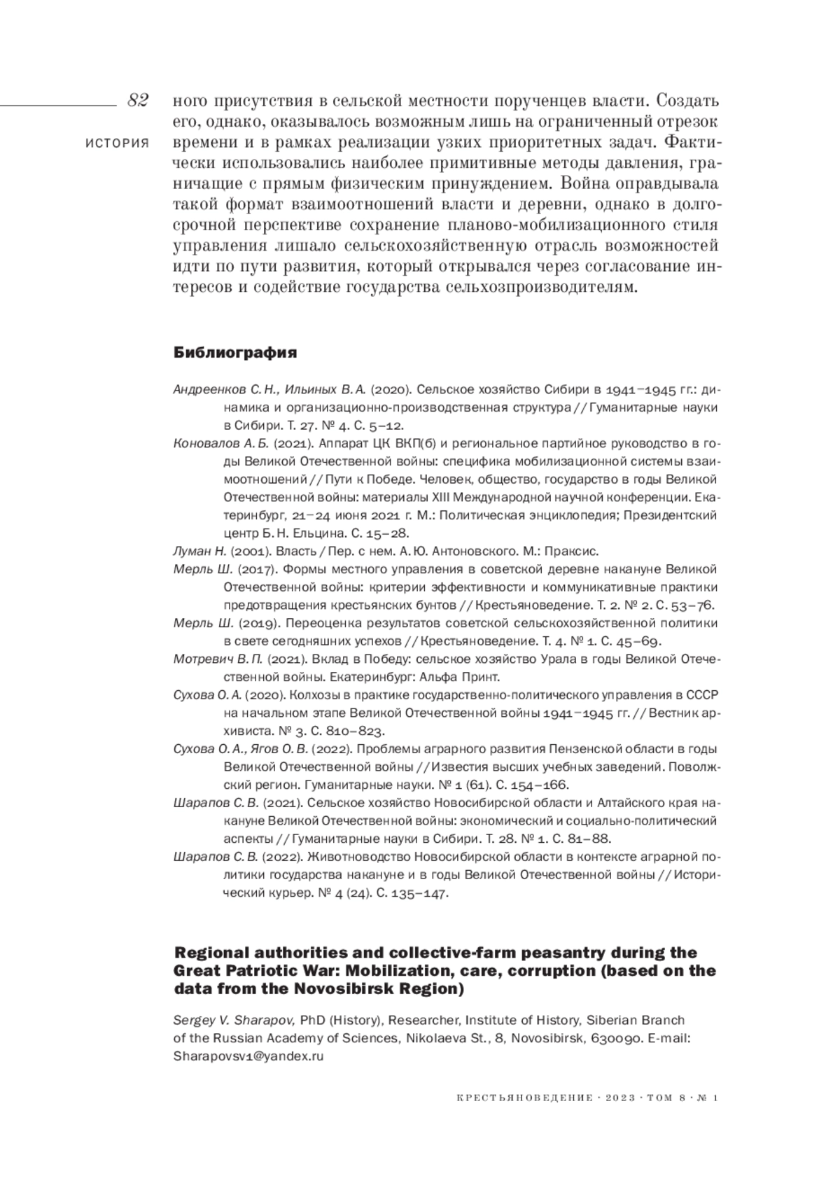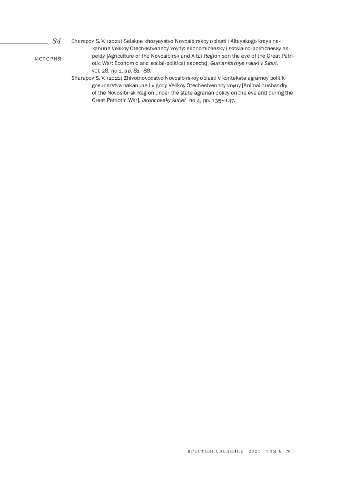 10. 	Шарапов С. В. (2022). Животноводство Новосибирской области в контексте аграрной политики государства накануне и в годы Великой Отечественной войны // Исторический курьер. № 4 (24). С. 135-147.  EDN: FOITYF