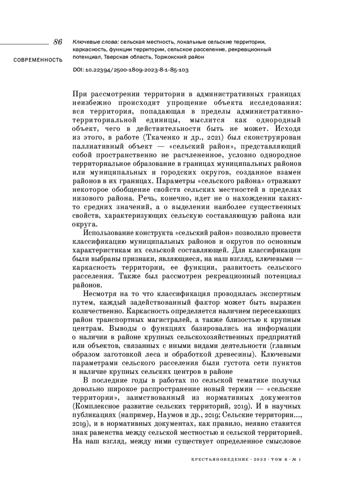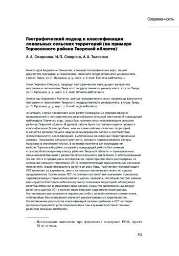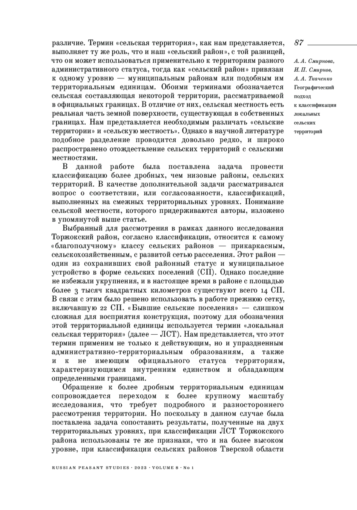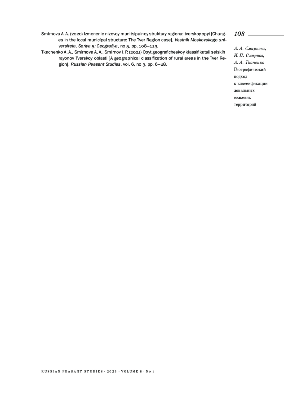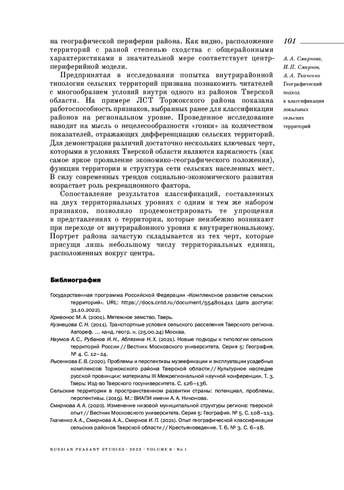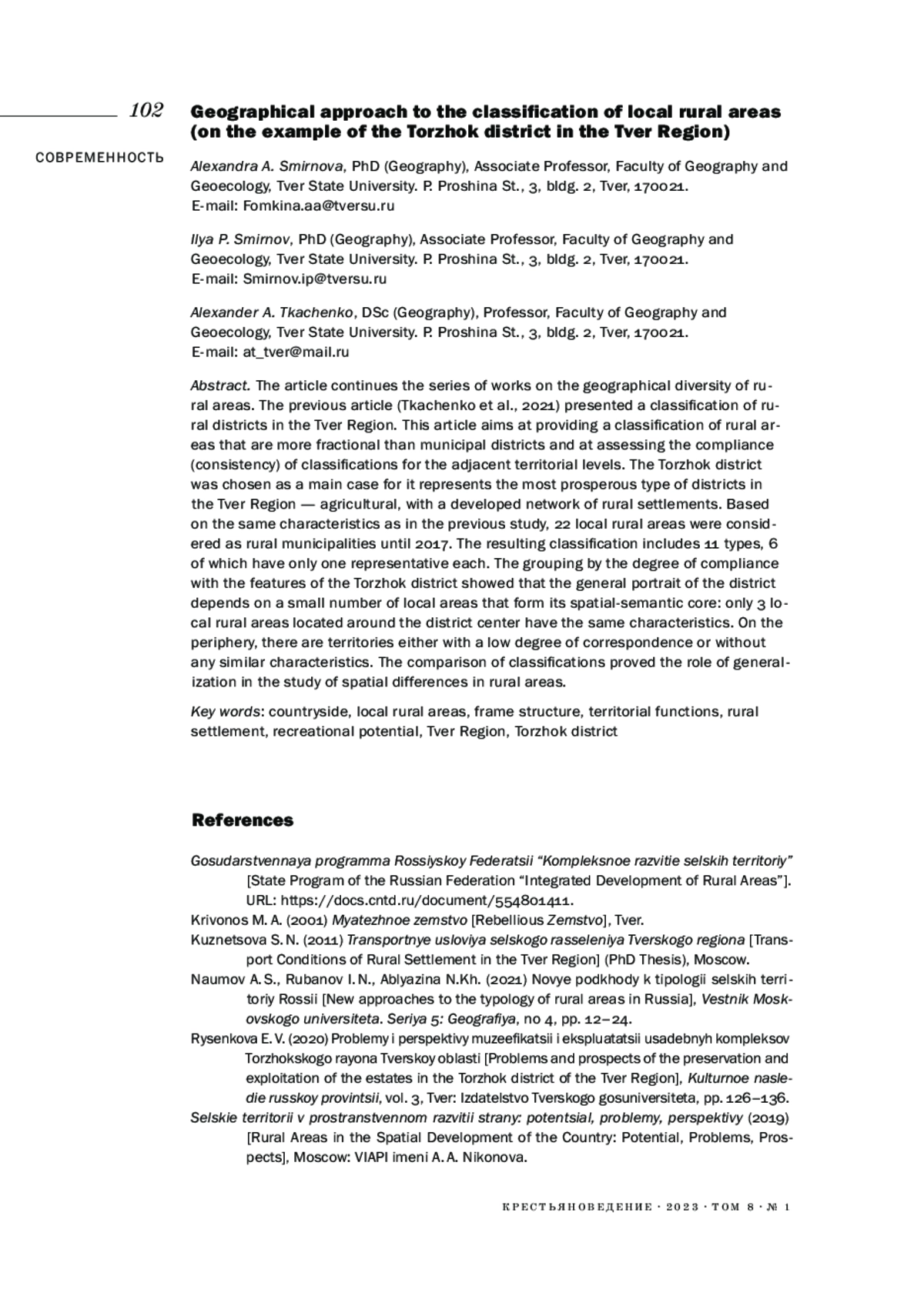 8. Ткаченко А. А., Смирнова А. А., Смирнов И. П. (2021). Опыт географической классификации сельских районов Тверской области // Крестьяноведение. Т. 6. № 3. С. 6-18. EDN: OXOXPB