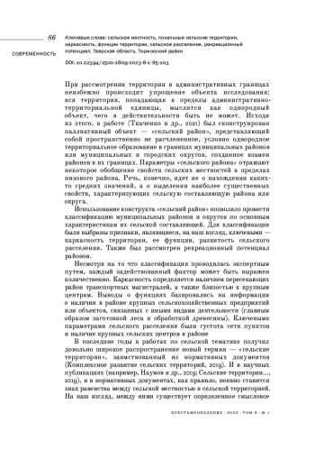 При рассмотрении территории в административных границах неизбежно происходит упрощение объекта исследования: вся территория, попадающая в пределы административнотерриториальной единицы, мыслится как однородный объект, чего в действительности быть не может. Исходя из этого, в работе (Ткаченко и др., 2021) был сконструирован паллиативный объект — «сельский район», представляющий собой пространственно не расчлененное, условно однородное территориальное образование в границах муниципальных районов или муниципальных и городских округов, созданное взамен районов в их границах. Параметры «сельского района» отражают некоторое обобщение свойств сельских местностей в пределах низового района. Речь, конечно, идет не о нахождении какихто средних значений, а о выделении наиболее существенных свойств, характеризующих сельскую составляющую района или округа.