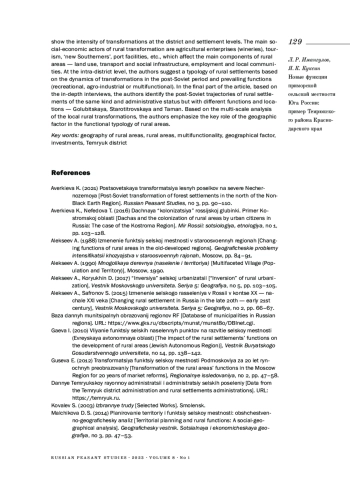 1. 	Аверкиева К. В. (2021). Постсоветская трансформация лесных поселков на севере Нечерноземья // Крестьяноведение. № 3. С. 90-110.  EDN: VIBBYK