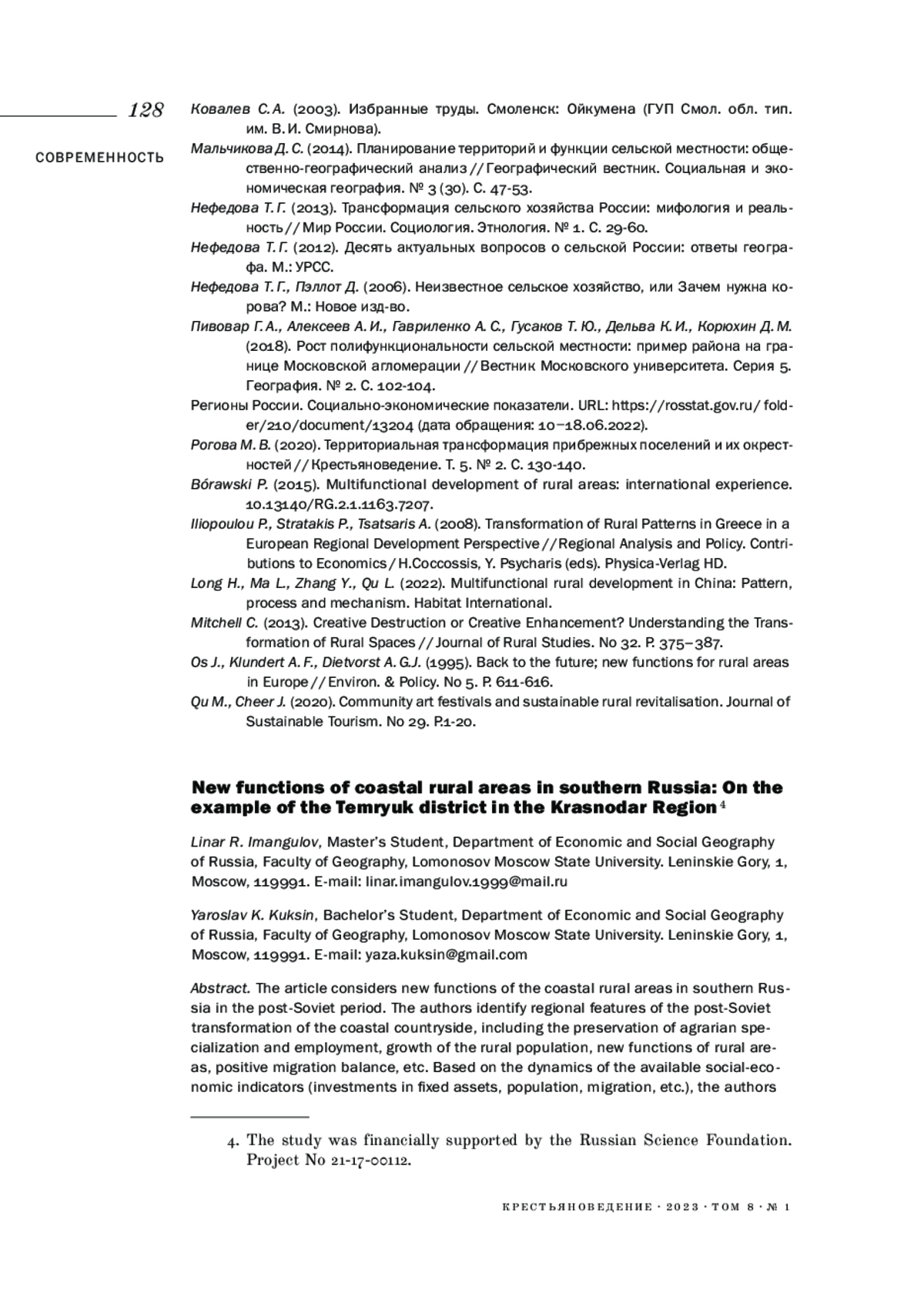 18. 	Рогова М. В. (2020). Территориальная трансформация прибрежных поселений и их окрестностей // Крестьяноведение. Т. 5. № 2. С. 130-140.  EDN: JVNNHI