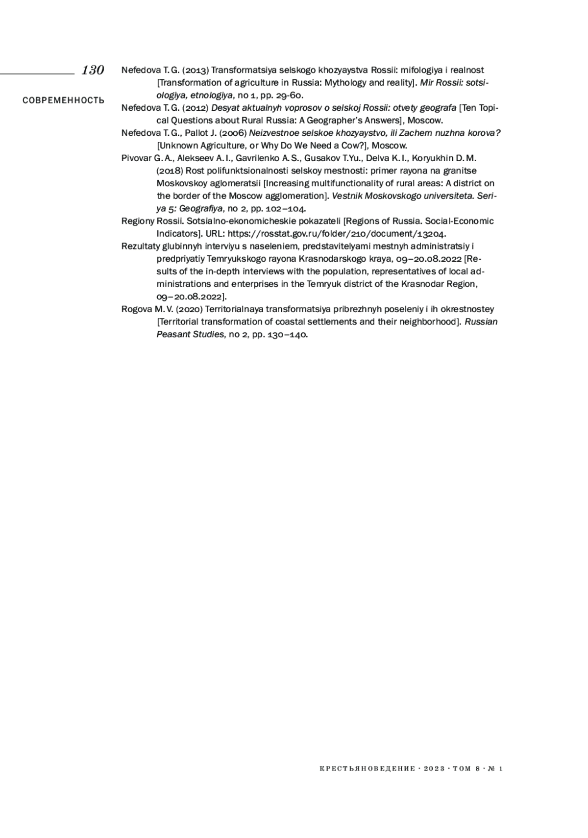 13. 	Нефедова Т. Г. (2013). Трансформация сельского хозяйства России: мифология и реальность // Мир России. Социология. Этнология. № 1. С. 29-60.  EDN: PVKGBV