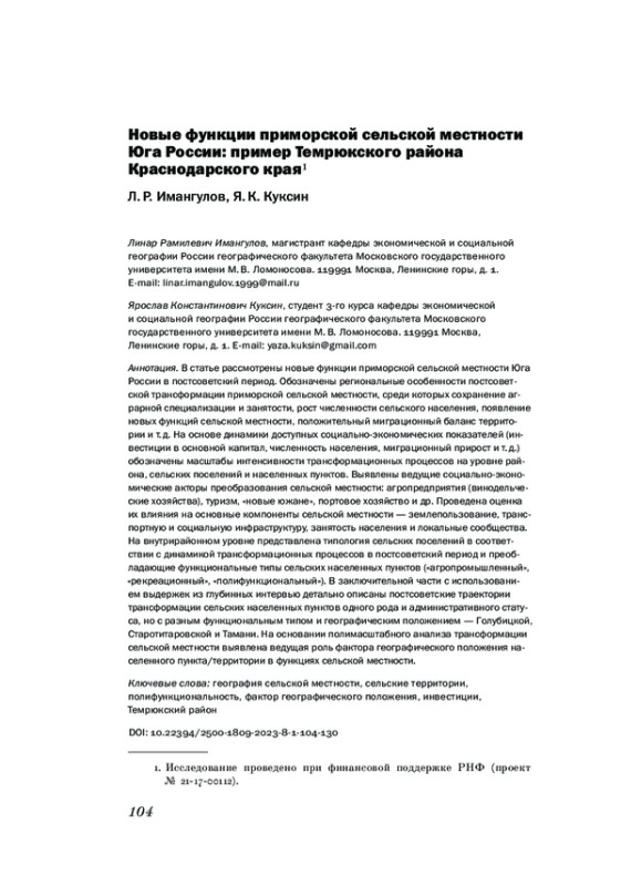 16. 	Пивовар Г. А., Алексеев А. И., Гавриленко А. С., Гусаков Т. Ю., Дельва К. И., Корюхин Д. М. (2018). Рост полифункциональности сельской местности: пример района на границе Московской агломерации // Вестник Московского университета. Серия 5. География. № 2. С. 102-104.  EDN: YUUDKM