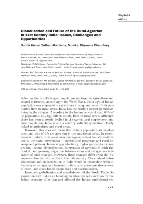 India has the world’s largest population employed in agriculture and related industries. According to the World Bank, about 43% of Indian population was employed in agriculture in 2019, and most of this population lives in rural areas. India has the world’s largest population living in the villages. According to the Indian census of 2011, 68% of its population, i. e., 833 million people, lived in rural areas. Although there has been a steady decline in the agricultural employment and rural population, India is still a country with the population closely linked to agriculture and rural areas