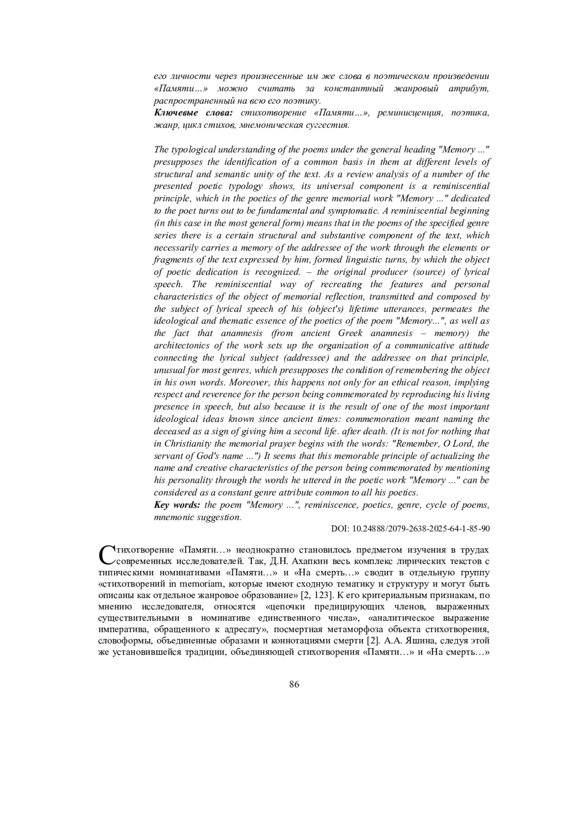 Стихотворение «Памяти…» неоднократно становилось предметом изучения в трудах современных исследователей. Так, Д. Н. Ахапкин весь комплекс лирических текстов с типическими номинативами «Памяти…» и «На смерть…» сводит в отдельную группу «стихотворений in memoriam, которые имеют сходную тематику и структуру и могут быть описаны как отдельное жанровое образование» [2, 123].