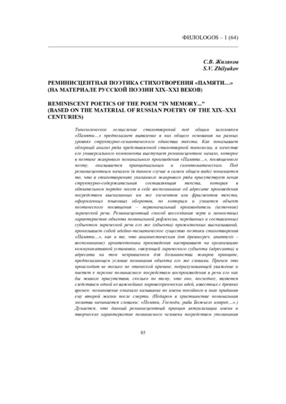 Типологическое осмысление стихотворений под общим заголовком «Памяти…» предполагает выявление в них общего основания на разных уровнях структурно-семантического единства текста. Как показывает обзорный анализ ряда представленной стихотворной типологии, в качестве его универсального компонента выступает реминисцентное начало, которое в поэтике жанрового поминального произведения «Памяти…», посвященного поэту, оказывается принципиальным и симптоматическим. Под реминисцентным началом (в данном случае в самом общем виде) понимается то, что в стихотворениях указанного жанрового ряда присутствует некая структурно-содержательная составляющая текста, которая в обязательном порядке несет в себе воспоминание об адресате произведения посредством высказанных им же элементов или фрагментов текста, оформленных языковых оборотов, по которым и узнается объект поэтического посвящения - первоначальный производитель (источник) лирической речи. Реминисцентный способ воссоздания черт и личностных характеристик объекта поминальной рефлексии, переданных и составленных субъектом лирической речи его же (объекта) прижизненных высказываний, пронизывает собой идейно-тематическое существо поэтики стихотворения «Памяти…», как и то, что анамнестическая (от древнегреч. anamnesis - воспоминание) архитектоника произведения настраивает на организацию коммуникативной установки, связующей лирического субъекта (адресанта) и адресата на том непривычном для большинства жанров принципе, предполагающем условие поминания объекта его же словами. Причем это происходит не только по этической причине, подразумевающей уважение и пиетет к персоне поминаемого посредством воспроизведения в речи его как бы живого присутствия, сколько по тому, что оно, последнее, является следствием одной из важнейших мировоззренческих идей, известных с древних времен: поминовение означало называние по имени покойного в знак придания ему второй жизни после смерти. (Недаром в христианстве поминальная молитва начинается словами: «Помяни, Господи, раба Божьего имярек…».) Думается, что данный реминисцентный принцип актуализации имени и творческих характеристик поминаемого человека посредством упоминания его личности через произнесенные им же слова в поэтическом произведении «Памяти…» можно считать за константный жанровый атрибут, распространенный на всю его поэтику.