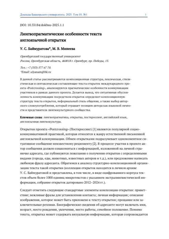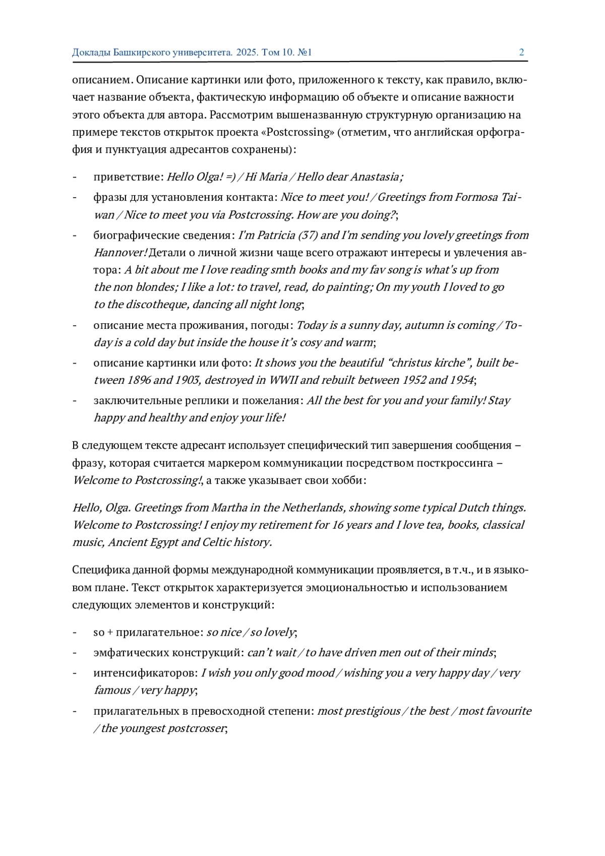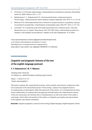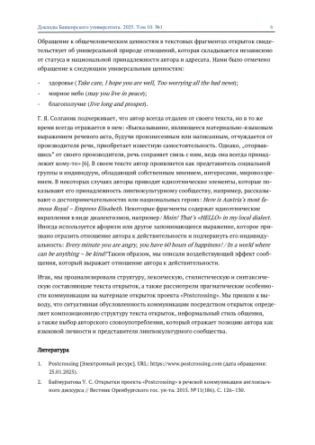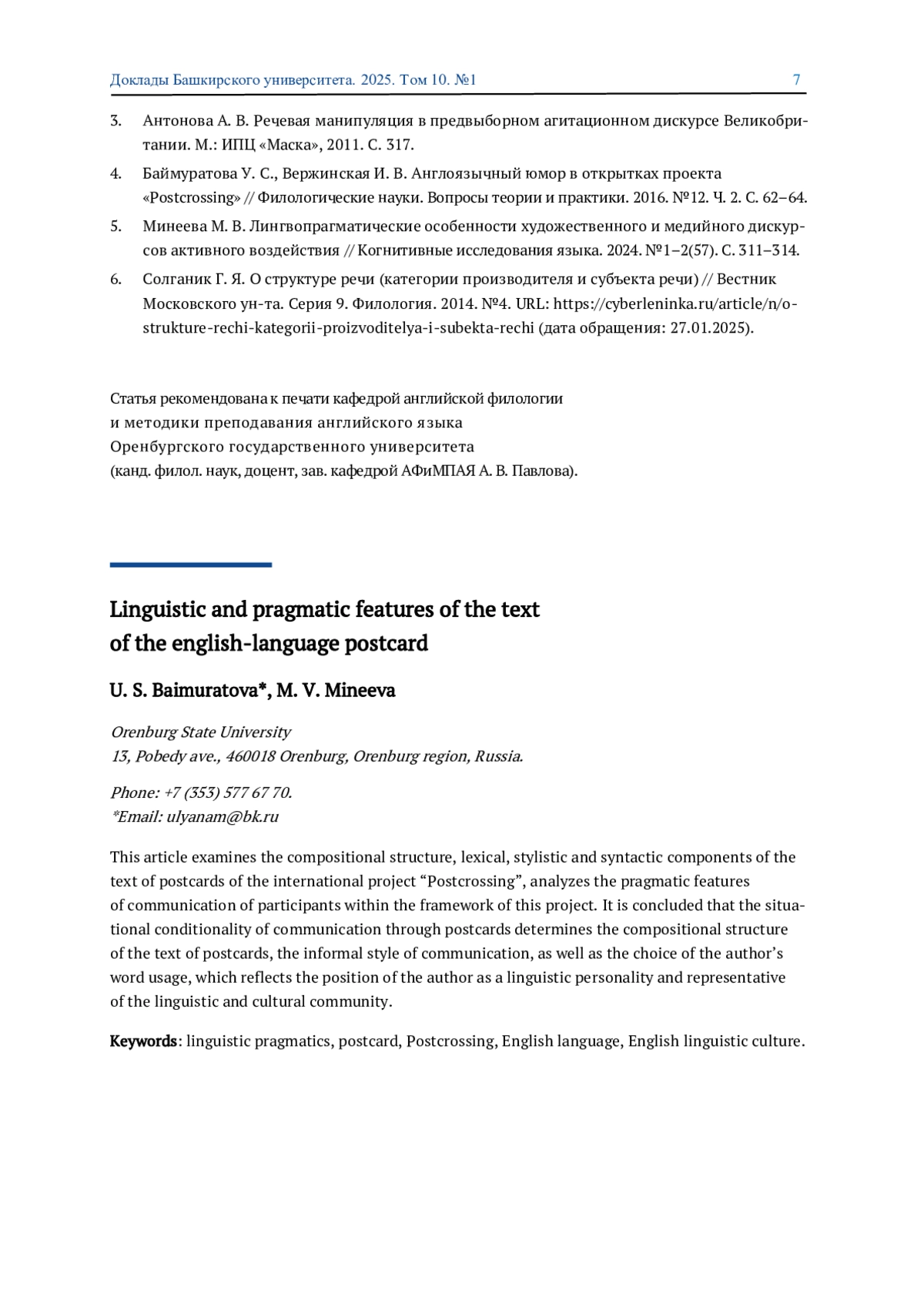 2. 	Баймуратова У. С. Открытки проекта “Postcrossing” в речевой коммуникации англоязычного дискурса // Вестник Оренбургского гос. ун-та. 2015. №11(186). С. 126-130.