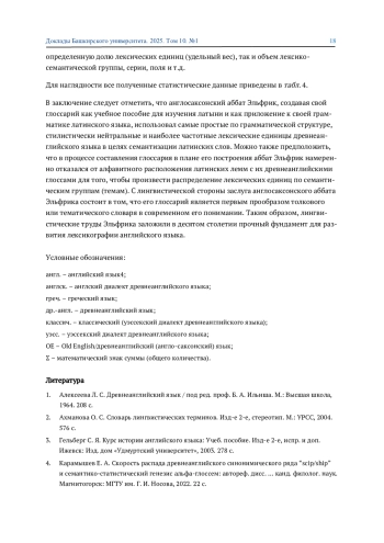 В данной статье рассматривается статистическое распределение тематических серий мореходной лексики в классическом древнеанглийском языке на материале глоссария Эльфрика. В работе представлена версия глоссария Эльфрика, датируемого концом X в. (так называемая версия А). Считается, что работы аббата Эльфрика (ок. 955-1020 гг.) являются образцами классического уэссекского диалекта древнеанглийского языка. В британской филологии этот период также известен как«поздний древнеанглийский». Глоссарий состоит из латинских лемм и древнеанглийских лексических единиц (глосс), расположенных по тематическим спискам. Семантический блок “Nomina Nauium” состоит из 39 глосс и включает в себя следующие тематические серии: «вид водного транспорта», «корабельный», «профессиональный» и «рыболовный».
