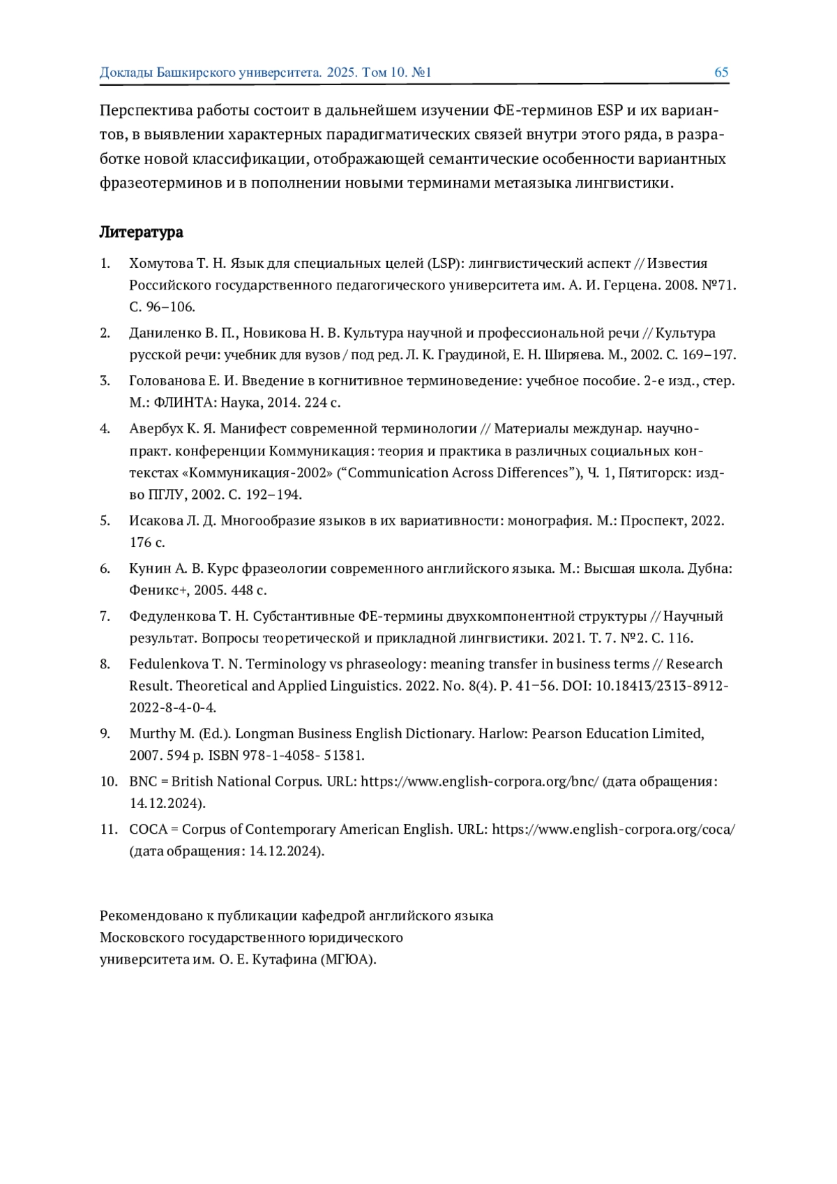 7. 	Федуленкова Т. Н. Субстантивные ФЕ-термины двухкомпонентной структуры // Научный результат. Вопросы теоретической и прикладной лингвистики. 2021. Т. 7. №2. C. 116. EDN: UEXKRM