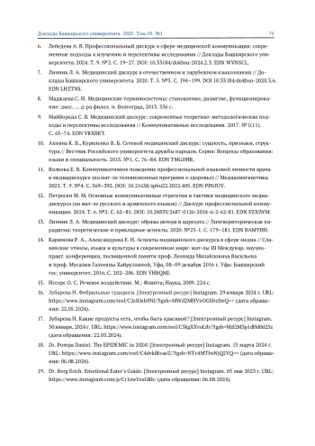 7. 	Линник Л. А. Медицинский дискурс в отечественном и зарубежном языкознании // Доклады Башкирского университета. 2020. Т. 5. №3. С. 194-199. DOI: 10.33184/dokbsu-2020.3.6 EDN: LHZTNS