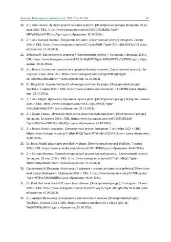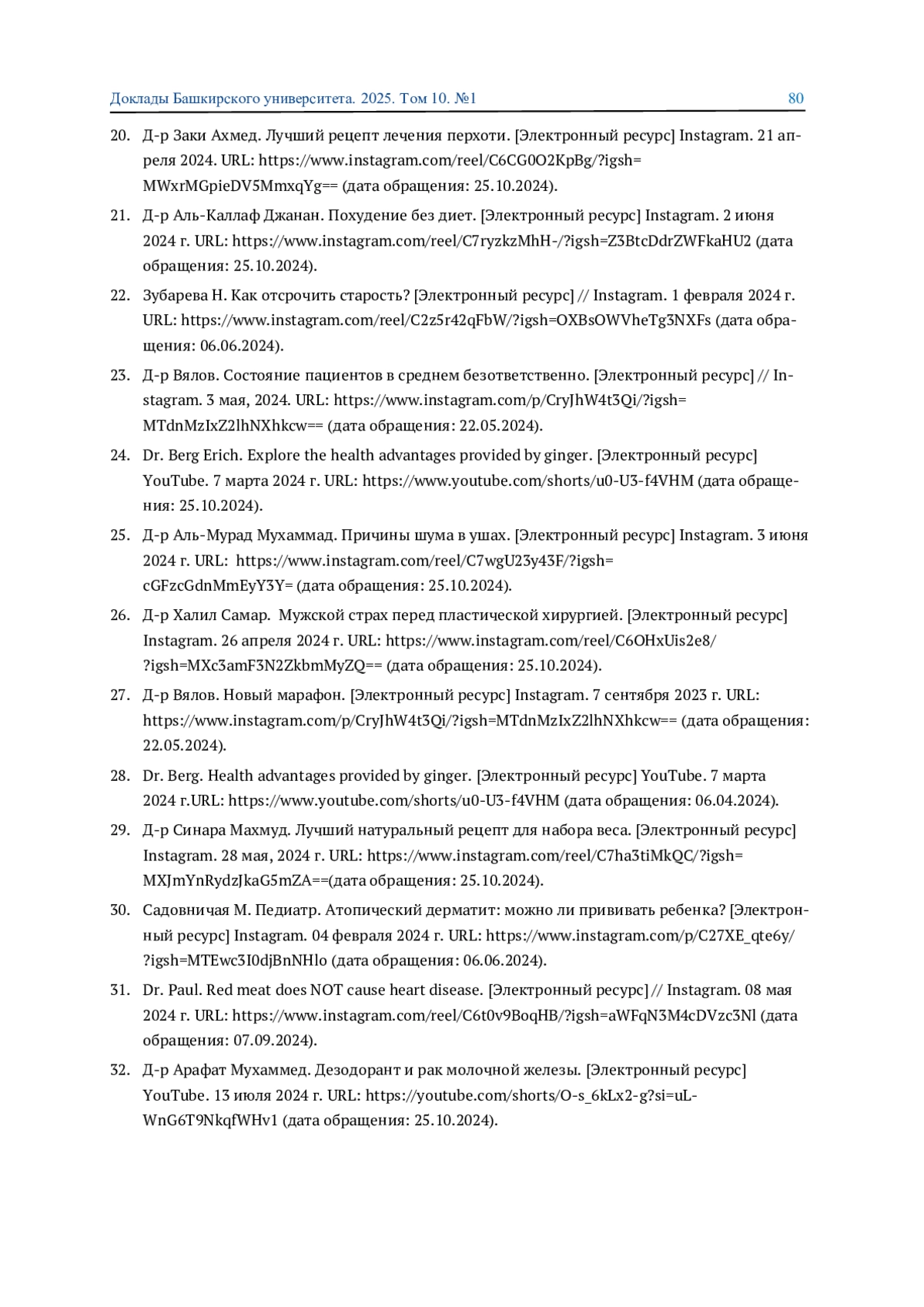 20. 	Д-р Заки Ахмед. Лучший рецепт лечения перхоти. [Электронный ресурс] Instagram. 21 апреля 2024. URL: https://www.instagram.com/reel/C6CG0O2KpBg/?igsh= MWxrMGpieDV5MmxqYg==(дата обращения: 25.10.2024).
