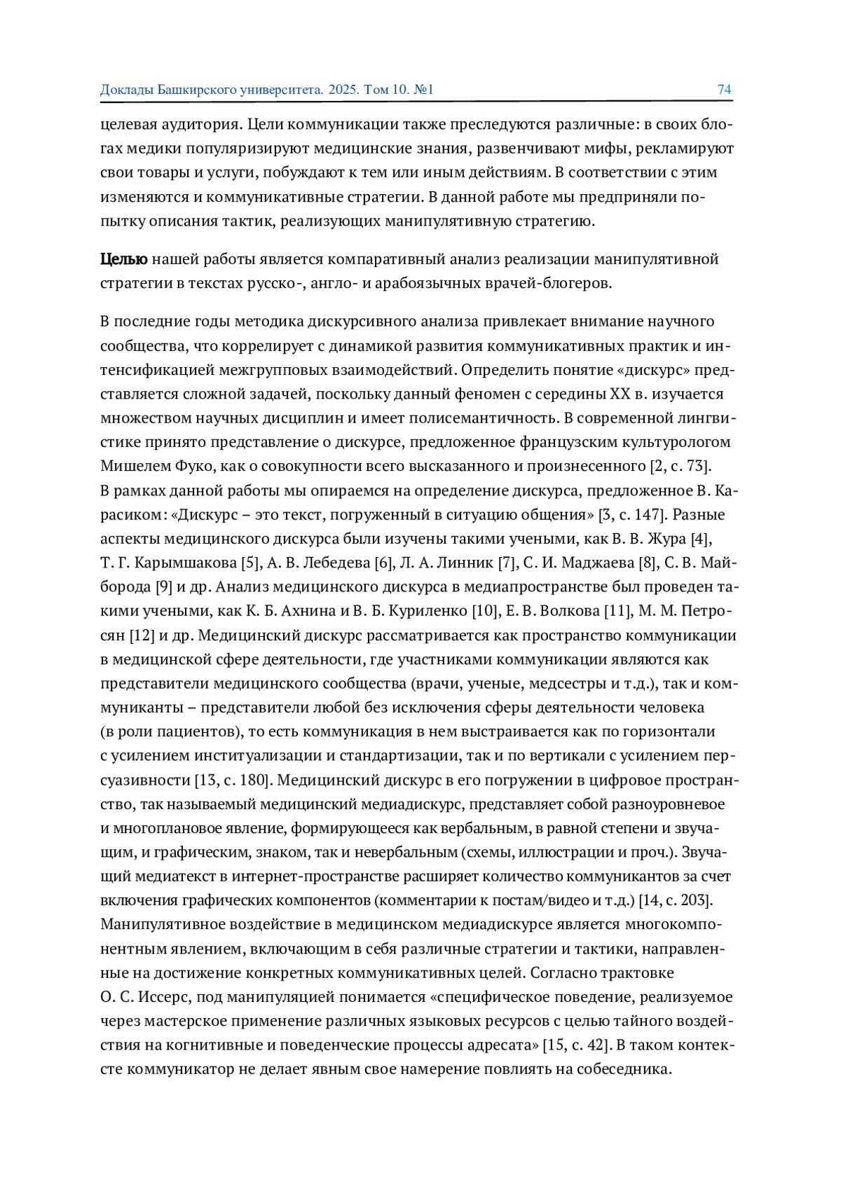 Медицинский дискурс трансформируется в медиамедицинский, характеризующийся высокой степенью медиатизации и активным вовлечением широкой аудитории. Мы провели анализ стратегий и тактик манипулятивного воздействия в медицинских блогах русскоязычного, англоязычного и арабоязычного сегментов социальных сетей. Результаты демонстрируют, что тактики риторических вопросов и обобщений усиливают персуазивный эффект и являются универсальными, что, на наш взгляд, связано с институциональностью медицинского дискурса.