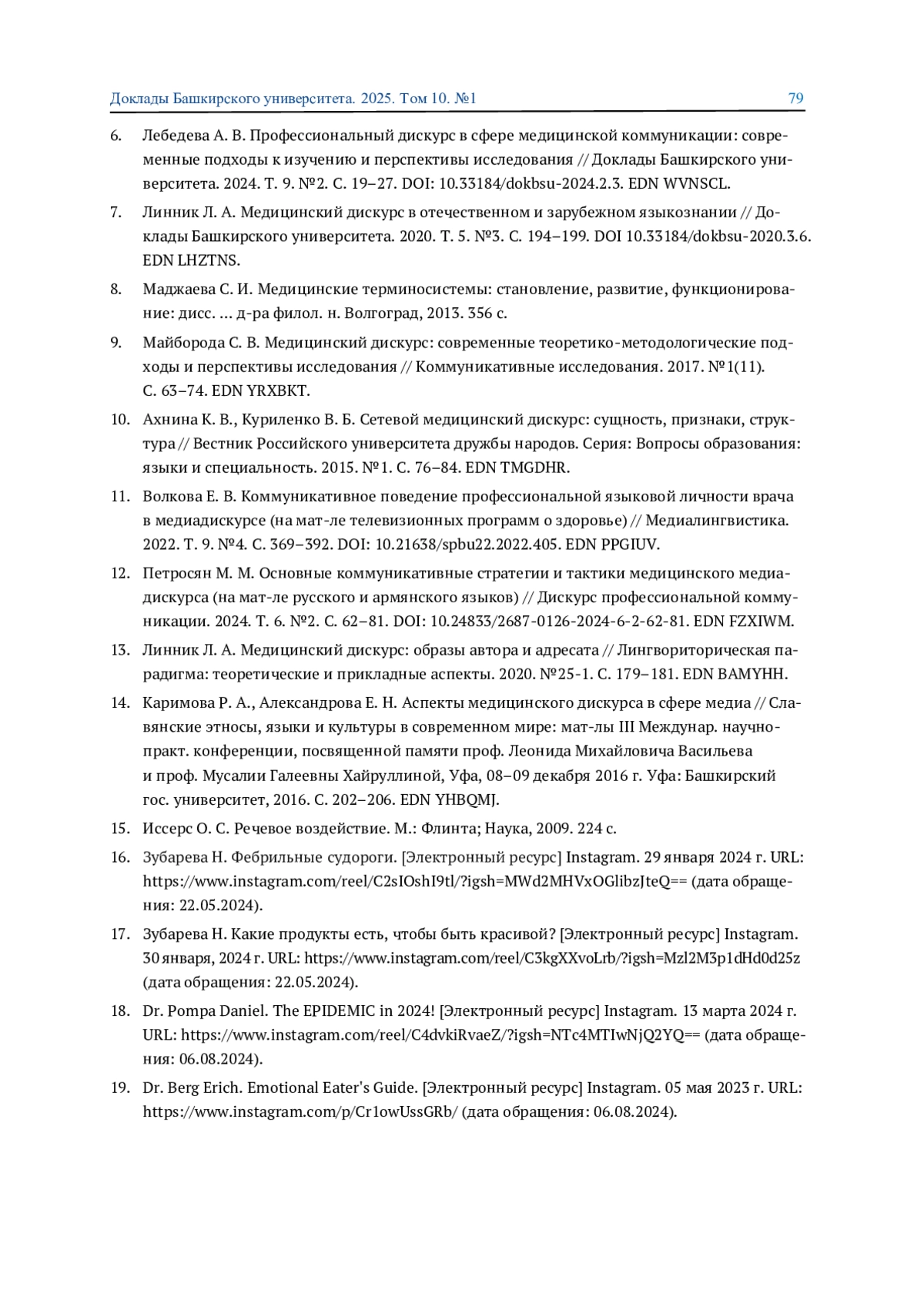 6. 	Лебедева А. В. Профессиональный дискурс в сфере медицинской коммуникации: современные подходы к изучению и перспективы исследования // Доклады Башкирского университета. 2024. Т. 9. №2. С. 19-27. DOI: 10.33184/dokbsu-2024.2.3 EDN: WVNSCL