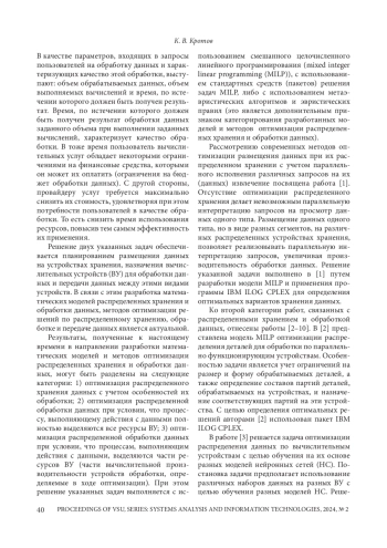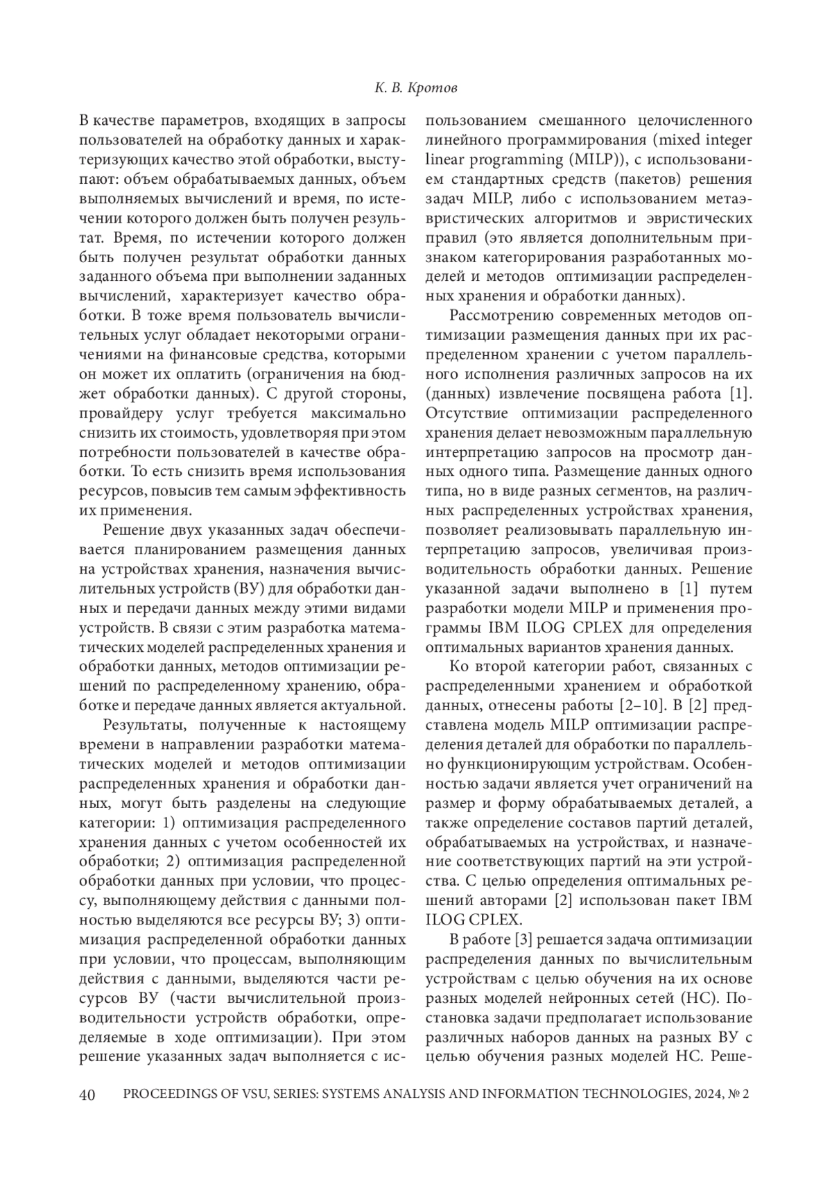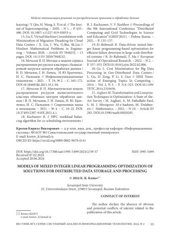 6. 	Кротов К. В. Иерархическая модель и алгоритм оптимизации решений при распределенном хранении и обработке данных / К. В. Кротов // Труды учебных заведений связи. - 2023. - Т. 9, № 2. - С. 112-127. 10.31854/ 1813-324X-2023-9-2-112-127. DOI: 10.31854/1813-324X-2023-9-2-112-127 EDN: TIXQZH