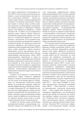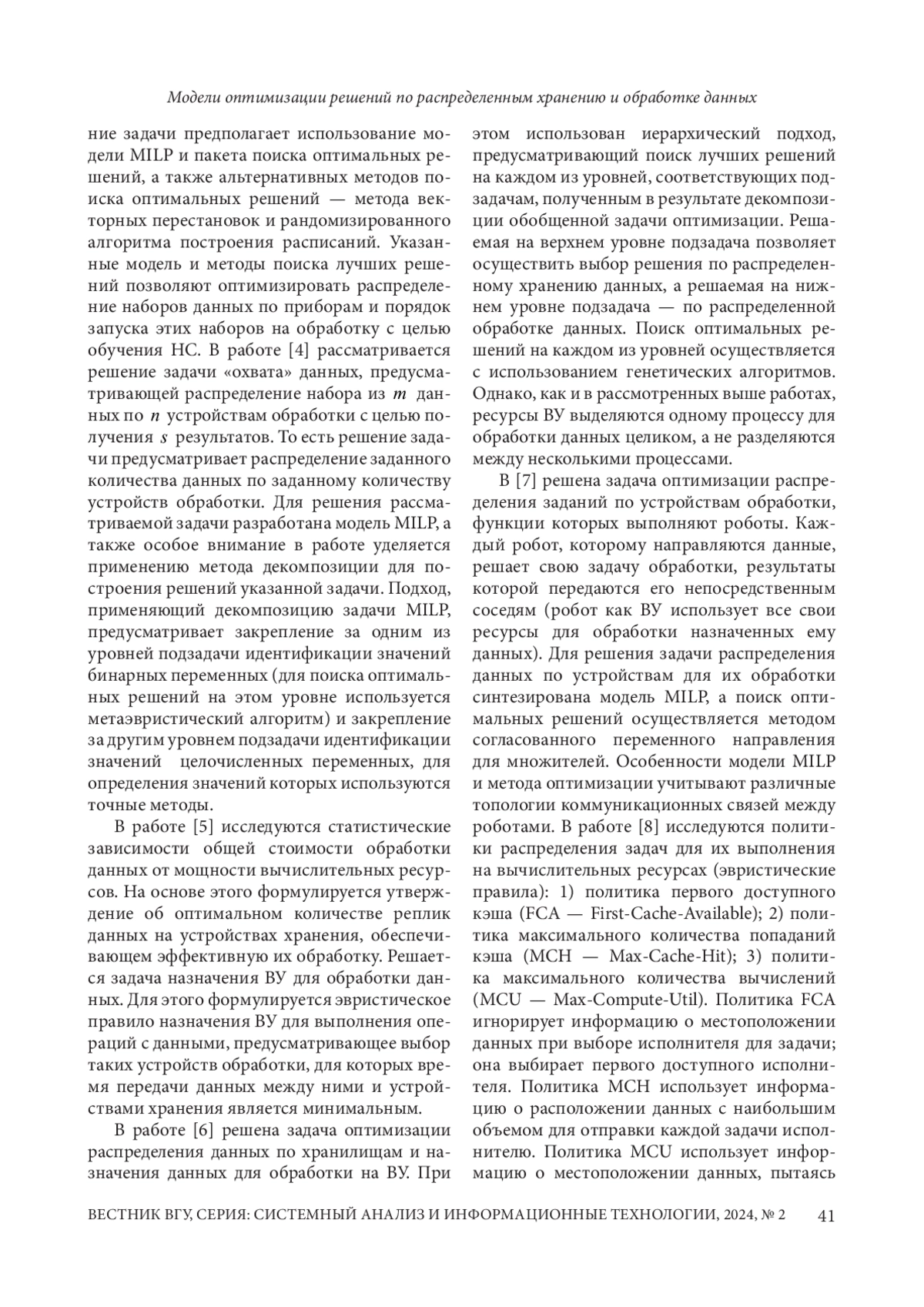 В результате анализа существующих методов оптимизации распределенных хранения и обработки данных могут быть сформулированы следующие их недостатки: 1) если оптимизация распределенной обработки данных осуществляется при условии, что процессам, выполняющим действия с данными, полностью выделяются все ресурсы ВУ, то это приводит к неэффективному их (ресурсов) использованию при возможности организации нескольких потоков вычислений на каждом ВУ; 2) если оптимизация распределенной обработки данных осуществляется при условии, что процессу, выполняющему действия, выделяется часть ресурсов ВУ (части вычислительной производительности устройств обработки), то необходимо определение доли производительности вычислительных устройств, выделяемых каждому процессу.