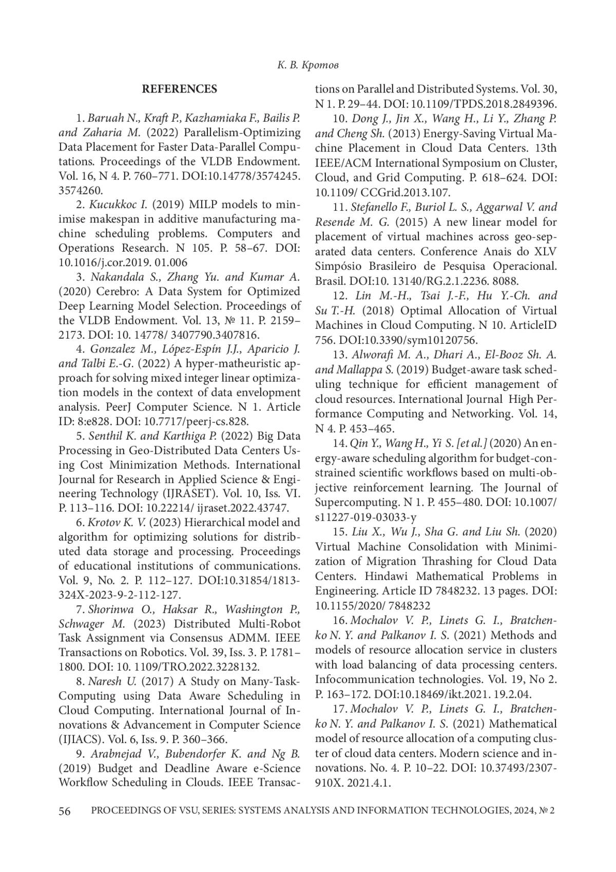 1. 	Baruah N. Parallelism-Optimizing Data Placement for Faster Data-Parallel Computations / N. Baruah, P. Kraft, F. Kazhamiaka, P. Bailis, M. Zaharia // Proceedings of the VLDB Endowment.- 2022. -Vol. 16, N 4. - P. 760-771. 10.14778/3574245. 3574260. DOI: 10.14778/3574245.3574260 EDN: POQPQM