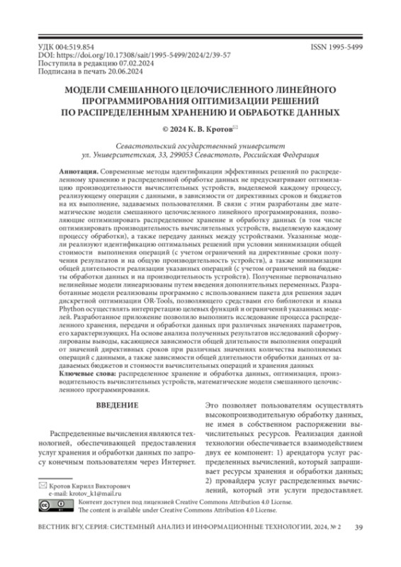 Современные методы идентификации эффективных решений по распределенному хранению и распределенной обработке данных не предусматривают оптимизацию производительности вычислительных устройств, выделяемой каждому процессу, реализующему операции с данными, в зависимости от директивных сроков и бюджетов на их выполнение, задаваемых пользователями. В связи с этим разработаны две математические модели смешанного целочисленного линейного программирования, позволяющие оптимизировать распределенное хранение и обработку данных (в том числе оптимизировать производительность вычислительных устройств, выделяемую каждому процессу обработки), а также передачу данных между устройствами. Указанные модели реализуют идентификацию оптимальных решений при условии минимизации общей стоимости выполнения операций (с учетом ограничений на директивные сроки получения результатов и на общую производительность устройств), а также минимизации общей длительности реализации указанных операций (с учетом ограничений на бюджеты обработки данных и на производительность устройств). Полученные первоначально нелинейные модели линеаризованы путем введения дополнительных переменных. Разработанные модели реализованы программно с использованием пакета для решения задач дискретной оптимизации OR-Tools, позволяющего средствами его библиотеки и языка Phython осуществлять интерпретацию целевых функций и ограничений указанных моделей. Разработанное приложение позволило выполнить исследование процесса распределенного хранения, передачи и обработки данных при различных значениях параметров, его характеризующих. На основе анализа полученных результатов исследований сформулированы выводы, касающиеся зависимости общей длительности выполнения операций от значений директивных сроков при различных значениях количества выполняемых операций с данными, а также зависимости общей длительности обработки данных от задаваемых бюджетов и стоимости вычислительных операций и хранения данных