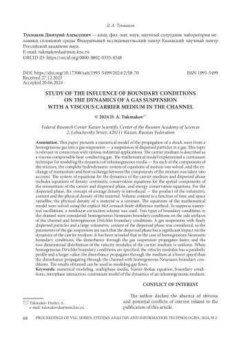 В данной работе представлена численная модель распространения ударной волны из однородного газа в газовзвесь - взвесь дисперсных частиц в газе. Данная тематика является актуальной в связи с различными промышленными приложениями. Несущая среда описывается как вязкий сжимаемый теплопроводный газ. Математическая модель реализует континуальную методику моделирования динамики неоднородных сред - для каждой из компонент смеси решалась полная гидродинамическая система уравнений движения, учитывался обмен импульсом и теплообмен между компонентами смеси. Система уравнений динамики несущей среды и дисперсной фазы включает в себя уравнения непрерывности плотности, уравнения сохранения пространственных составляющих импульса несущей и дисперсной фазы, уравнения сохранения энергии. Для дисперсной фазы вводится понятие средней плотности - произведения объемного содержания на физическую плотность материала. Объемное содержание является функцией временной и пространственных переменных, физическая плотность материла является постоянной величиной. Уравнения математической модели решались явным конечно-разностным методом Мак-Кормака. Для подавление численных осцилляций применялась схема нелинейной коррекции. Рассматривались два типа граничных условий в канале - однородные граничные условия Неймана на боковых поверхностях канала и однородные граничные условия Дирихле. Рассматривалась газовзвесь с мелкодисперсными частицами и большим объемным содержанием дисперсной фазы, таким образом параметры газовзвеси таковы, что дисперсная фаза оказывает существенное влияние на динамику несущей среды. Выявлено, что в случае однородных граничных условий Неймана возмущение по газовзвеси распространяется быстрее, двухмерное распределение модуля скорости несущей среды является равномерным. При задании однородных граничных условий Дирихле модуль скорости имеет параболический профиль и большее значение, возмущение по среде распространяется с меньшей скоростью, чем возмущение распространяющееся по каналу с однородными граничными условиями Неймана. Полученные результаты могут быть использованы при моделировании течений газовзвсей.