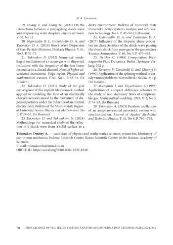 23. Тукмаков Д. А. Методика численного исследования отражения ударной волны от твердой поверхности в запылённой среде / Д. А. Тукмаков, Н. А. Тукмакова // Вестник Воронежского государственного университета. Серия системный анализ и информационные технологии. - 2019. - № 4. - C. 47-54. EDN: AOTPFN