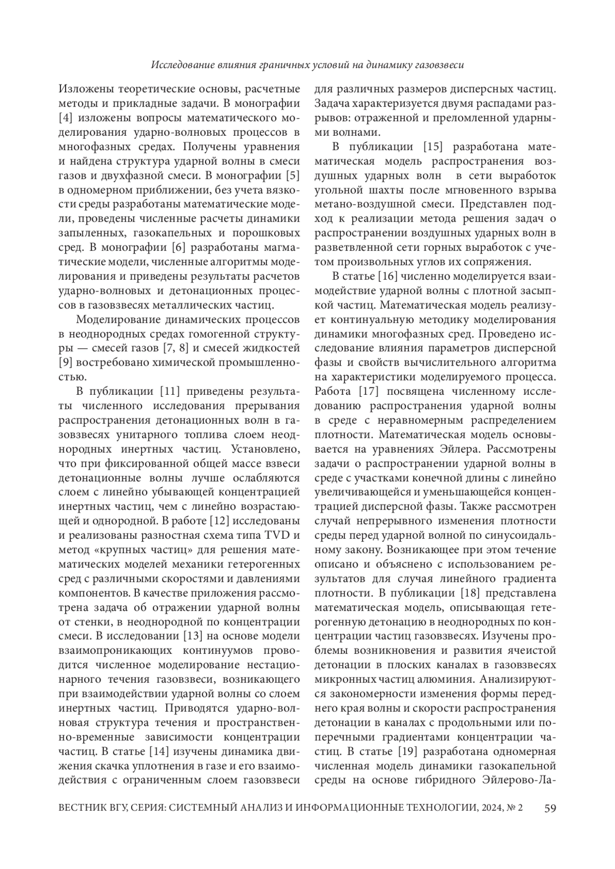 В публикации [11] приведены результаты численного исследования прерывания распространения детонационных волн в газовзвесях унитарного топлива слоем неоднородных инертных частиц. Установлено, что при фиксированной общей массе взвеси детонационные волны лучше ослабляются слоем с линейно убывающей концентрацией инертных частиц, чем с линейно возрастающей и однородной. В работе [12] исследованы и реализованы разностная схема типа TVD и метод «крупных частиц» для решения математических моделей механики гетерогенных сред с различными скоростями и давлениями компонентов. В качестве приложения рассмотрена задача об отражении ударной волны от стенки, в неоднородной по концентрации смеси.