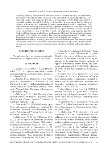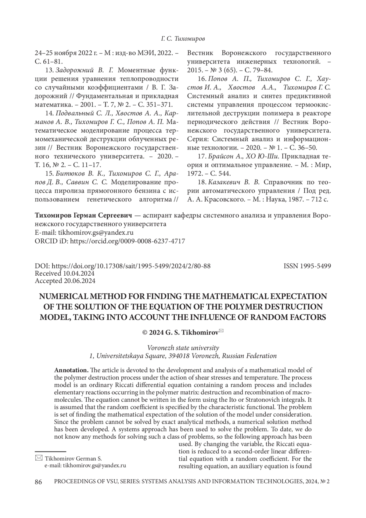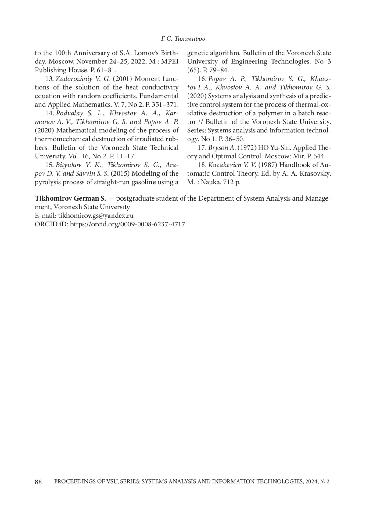 16. 	Попов А. П., Тихомиров С. Г., Хаустов И. А., Хвостов А.А., Тихомиров Г. С. Системный анализ и синтез предиктивной системы управления процессом термоокислительной деструкции полимера в реакторе периодического действия // Вестник Воронежского государственного университета. Серия: Системный анализ и информационные технологии. - 2020. - № 1. - С. 36-50. EDN: LLVDQL
