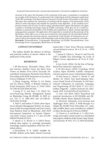 6. Демочкин П. Б. Масштабируемые zk-SNARK / П. Б. Демочкина // Вестник Балтийского федерального университета им. И. Канта. Серия: Физико-математические и технические науки. - 2020. - № 4. - С. 34-41. EDN: JIMMOU