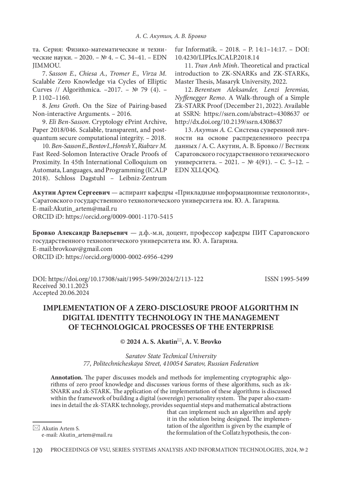 В работе обсуждаются модели и методы реализации криптографических алгоритмов доказательства с нулевым разглашением и рассматриваются различные формы этих алгоритмов, такие как zk-SNARK и zk-STARK. Применение реализации данных алгоритмов обсуждается в рамках построения системы цифровой (суверенной) личности. Также в работе подробно разбирается технология zk-STARK, приводятся последовательные шаги и математические абстракции, которые могут реализовать подобный алгоритм и применить его в конструируемом решении. Реализация алгоритма приводится на примере формулировки гипотезы Коллатца, рассматривается построение запроса, формирование ограничений запроса (constraints), описывается пример формирования полинома с высокой степенью и последующего применения технологии FRI (Fast Reed-Solomon Interactive Oracle Proofs of Proximity). В работе также разбирается механизм работы со степенями полинома, позволяющий снизить степень и упростить работу алгоритма. Предложен новый метод, позволяющий повысить безопасность систем, использующих распределенный реестр данных (блокчейн): в работе рассматривается разработанный прототип, использующий технологию zk-STARK, которая избавляется от доверенной установки (потенциальной уязвимости zk-SNARK) и реализует алгоритм, устойчивый к атакам, с использованием квантовых компьютеров. Применение алгоритма рассматривается на прототипе блокчейна, который позволяет выпускать новые транзакции с поддержкой описанного метода. В работе приведены метрики прототипа, измерение количества транзакций в секунду, а также времени отклика узла блокчейна и потребляемой одним узлом оперативной памяти.