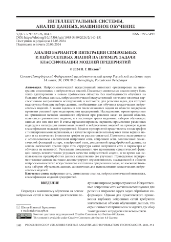 Нейросимволический искусственный интеллект ориентирован на интеграцию символьных и нейросетевых знаний. Поскольку символьные знания могут быть легко адаптированы к новым проблемным областям без необходимости обучения на больших объемах данных, нейросимволический искусственный интеллект является перспективным направлением исследований, в частности, для решения задач, для которых недоступны большие наборы данных, необходимые для обучения классических нейросетевых моделей. К таким задачам в том числе относятся задачи из области поддержки принятия решений при моделировании предприятий. Исследования, ориентированные на применение методов машинного обучения при решении задач из данной области, появились сравнительно недавно, и в настоящее время надежных наборов обучающих данных для них еще нет. В статье проанализированы варианты применения различных подходов к интеграции символьных знаний и нейросетевых моделей на примере задачи классификации моделей предприятий. Модели предприятий представлены в виде графов с типизированными вершинами, а в качестве признаков используются типы вершин модели и их количество (топология графов не рассматривается). Проведены эксперименты с использованием классической нейронной сети, нейронной сети, дополненной семантической функцией потерь, и нейронной сети, дополненной предобработкой данных на основе логических правил (при этом структура самой нейронной сети и параметры ее обучения не меняются). Результаты показывают, что применение семантической функции потерь незначительно ухудшает качество нейросетевой модели, в то время как использование предобработки данных существенно его улучшает. Приведенные экспериментальные данные наглядно демонстрируют перспективность исследований в области нейросимволического искусственного интеллекта при решении задач, не имеющих больших наборов обучающих данных, достаточных для использования классических нейросетевых моделей.