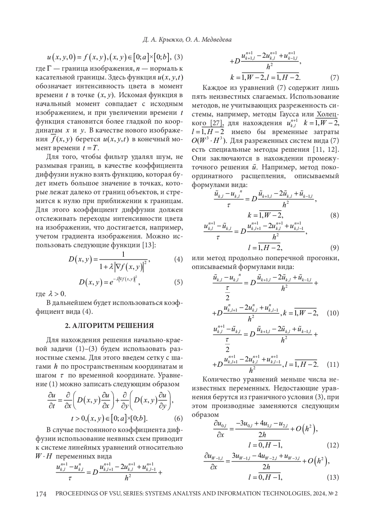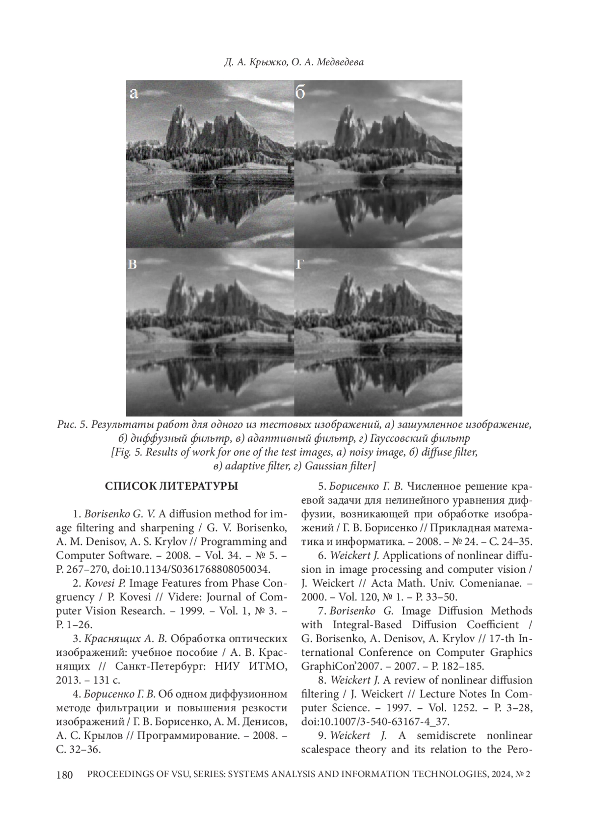 4. 	Борисенко Г. В. Об одном диффузионном методе фильтрации и повышения резкости изображений / Г. В. Борисенко, А. М. Денисов, А. С. Крылов // Программирование. - 2008. -С. 32-36. EDN: LMBVBD