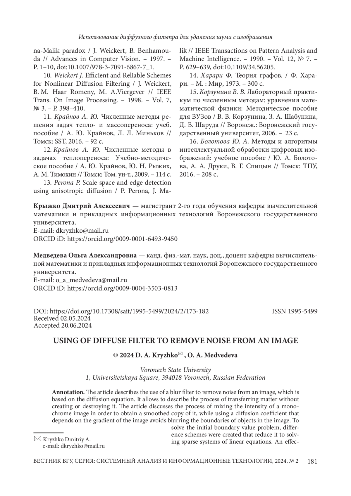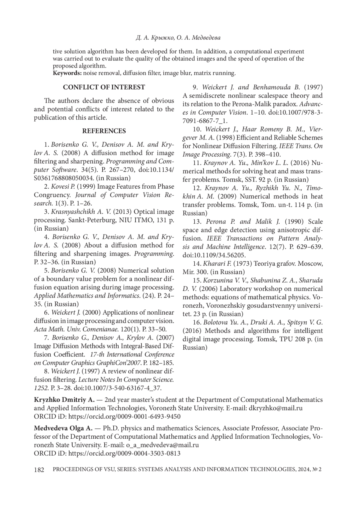 1. 	Borisenko G. V. A diffusion method for image filtering and sharpening / G. V. Borisenko, A. M. Denisov, A. S. Krylov // Programming and Computer Software. - 2008. - Vol. 34. - № 5. -P. 267-270,. DOI: 10.1134/S0361768808050034 EDN: LLLAZB