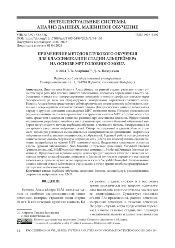 Диагностика болезни Альцгеймера на ранней стадии развития играет существенную роль при лечении данного заболевания, поскольку определение тяжести заболевания и риска его прогрессирования позволяет провести профилактические меры своевременно, до того, как сформируются необратимые поражения головного мозга. Болезнь Альцгеймера представляет собой хроническое дегенеративное заболевание, связанное с повреждением нейронов головного мозга. Для диагностики данного заболевания наряду с другими методами используется МРТ головного мозга. Интерес представляют формализованные автоматизированные инструменты анализа МРТ, которые могут служить средством поддержки принятия решений при постановке диагноза. Эффективным механизмом разработки подобных инструментов при наличии большой обучающей выборки могут служить методы глубокого обучения, в частности методы, базирующиеся на построении сверточных нейронных сетей. Обзор исследований в данной области отражает целый ряд успешных вычислительных экспериментов по применению сверточных нейронных сетей к анализу медицинских изображений. В данной работе осуществляется попытка использовать сверточную нейронная сеть (CNN) для классификации стадии болезни Альцгеймера на основе МРТ головного мозга. Выделяются следующие основные классы (уровни заболевания): NonDementia (отсутствие деменции), VeryMildDementia (ранняя деменция), MildDementia (умеренная деменция), ModerateDementia (тяжелая деменция). Предложенная в работе модель демонстрирует хорошее качество с позиции основных метрик классификации, позволяет с большой точностью определять все стадии заболевания, причем, лучше всего определяется класс VeryMildDemented. Распознавание именно данной стадии заболевания очень важно с точки зрения подбора предупреждающего развитие болезни лечения.