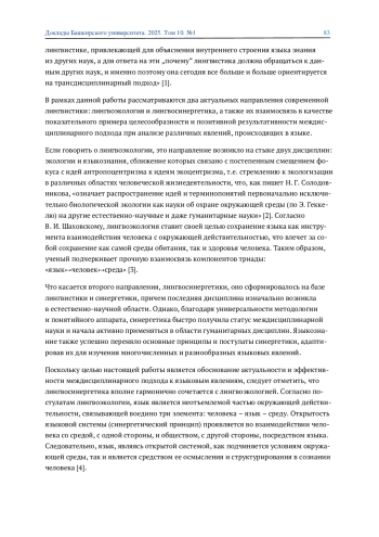Статья посвящена рассмотрению актуальности и обоснованности применения междисциплинарного подхода в языкознании. Основой работы является синтез методик двух актуальных современных лингвистических направлений: лингвоэкологии и лингвосинергетики, что открывает возможности для более глубокого и всестороннего исследования особенностей экологичной или неэкологичной коммуникации, а также для построения моделей ее развития на примере коммуникативно-эмоциональной ситуации, взятой из англоязычного художественного дискурса. Выявлено, что комплексный подход подтверждает эффективность своего применения для более глубокого и всестороннего анализа структурирования и функционирования широкого круга языковых явлений.