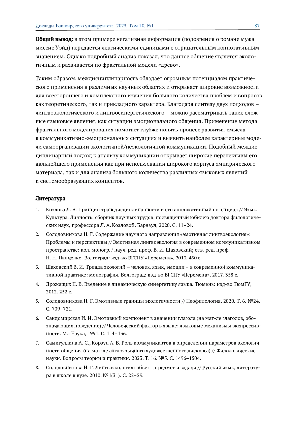 2. Солодовникова Н. Г. Содержание научного направления “эмотивная лингвоэкология”: Проблемы и перспективы // Эмотивная лингвоэкология в современном коммуникативном пространстве: кол. моногр. / науч. ред. проф. В. И. Шаховский; отв. ред. проф. Н. Н. Панченко. Волгоград: изд-во ВГСПУ “Перемена”, 2013. 450 с.
