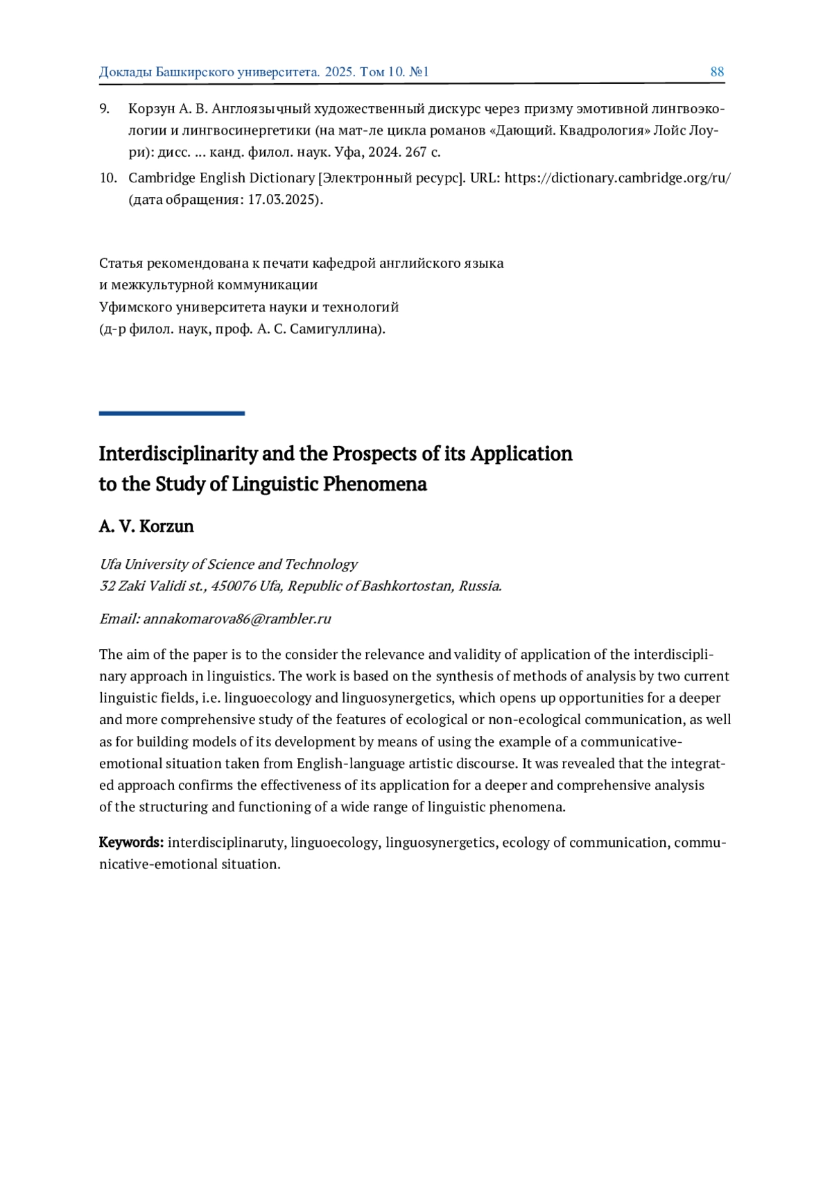 9. Корзун А. В. Англоязычный художественный дискурс через призму эмотивной лингвоэкологии и лингвосинергетики (на мат-ле цикла романов “Дающий. Квадрология” Лойс Лоури): дисс канд. филол. наук. Уфа, 2024. 267 с.