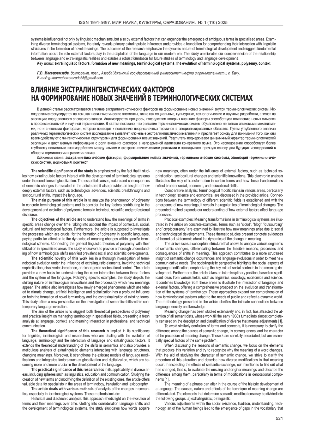 В данной статье рассматривается влияние экстралингвистических факторов на формирование новых значений внутри терминологических систем. Ис следование фокусируется на том, как нелингвистические элементы, такие как социальные, культурные, технологические и научные разработки, влияют на эволюцию определенного словарного запаса. Анализируются процессы, посредством которых внешние факторы способствуют появлению новых смыслов в профессиональной и научной терминологии. В статье показано, что развитие терминологических систем обусловлено не только языковыми механизма ми, но и внешними факторами, которые приводят к появлению неоднозначных терминов в специализированных областях. Путем углубленного анализа различных терминологических систем исследование выявляет ключевые экстралингвистические влияния и предлагает основу для понимания того, как они взаимодействуют с лингвистическими структурами для формирования новых значений. Результаты подчеркивают динамичный характер терминологической эволюции и дают ценную информацию о роли внешних факторов в непрерывной адаптации конкретного языка. Это исследование способствует более глубокому пониманию взаимодействия между языком и экстралингвистическими реалиями и закладывает прочную основу для будущих исследований в области терминологии и развития языка.